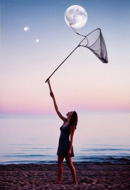 F-B-C, foreground: a woman with a net , background: full moon in the sky , effect: the woman catches the moon in her net