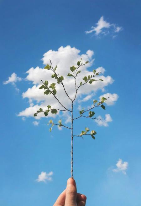 F-B-C, POV, foreground: a hand holding a tree branch , background: clouds , effect: a tree with clouds as leafs
