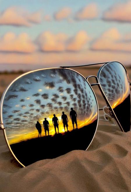 Example: F-B-C, reflection, silhouette, two people reflecting into glasses, rayban glasses, sunset, clouds
