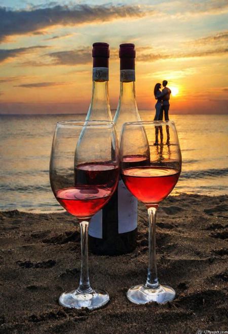 F-B-C, foreground: a bottle of wine and two gless filled with wine , background: a couple hugging next to the sea , effect: the couple is standing in a glass of wine