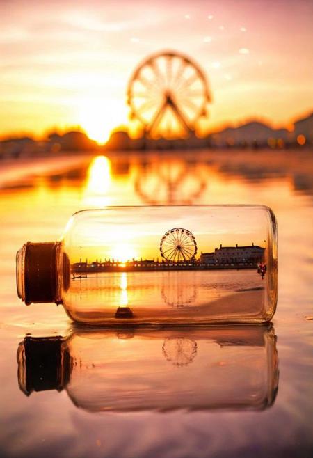 F-B-C, sharp foreground: a bottle on a beach , blurry background: a ferris wheel next to a setting sun , effect: the bottle encapsulate the background