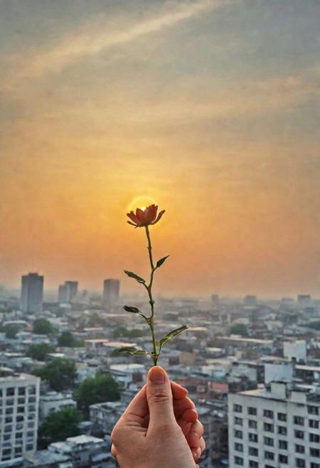 F-B-C, POV, foreground: a hand holding a flower stem , background: sunset above city , effect: the sun as a flower