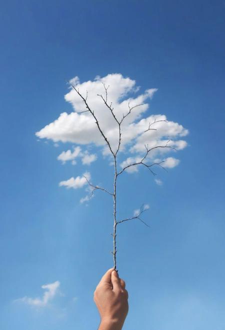 F-B-C, POV, foreground: a hand holding a tree branch , background: clouds , effect: a tree with clouds as leafs