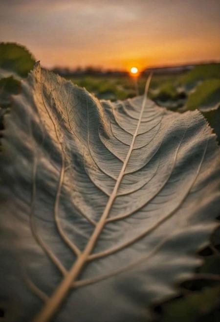 F-B-C, foreground: a leaf depth of field , background: sunset , effect: