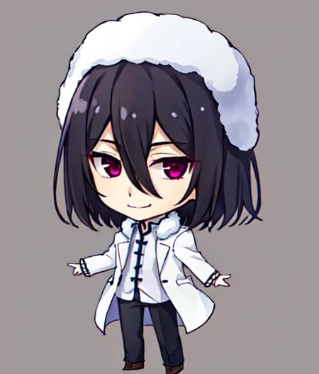 <lora:Fyodor_Dostoyevsky:0.7>, 1boy, solo, male focus, black hair, medium hair, magenta eyes, smirk, hair between eyes, ushanka, full body, cloak, fur trim, boots