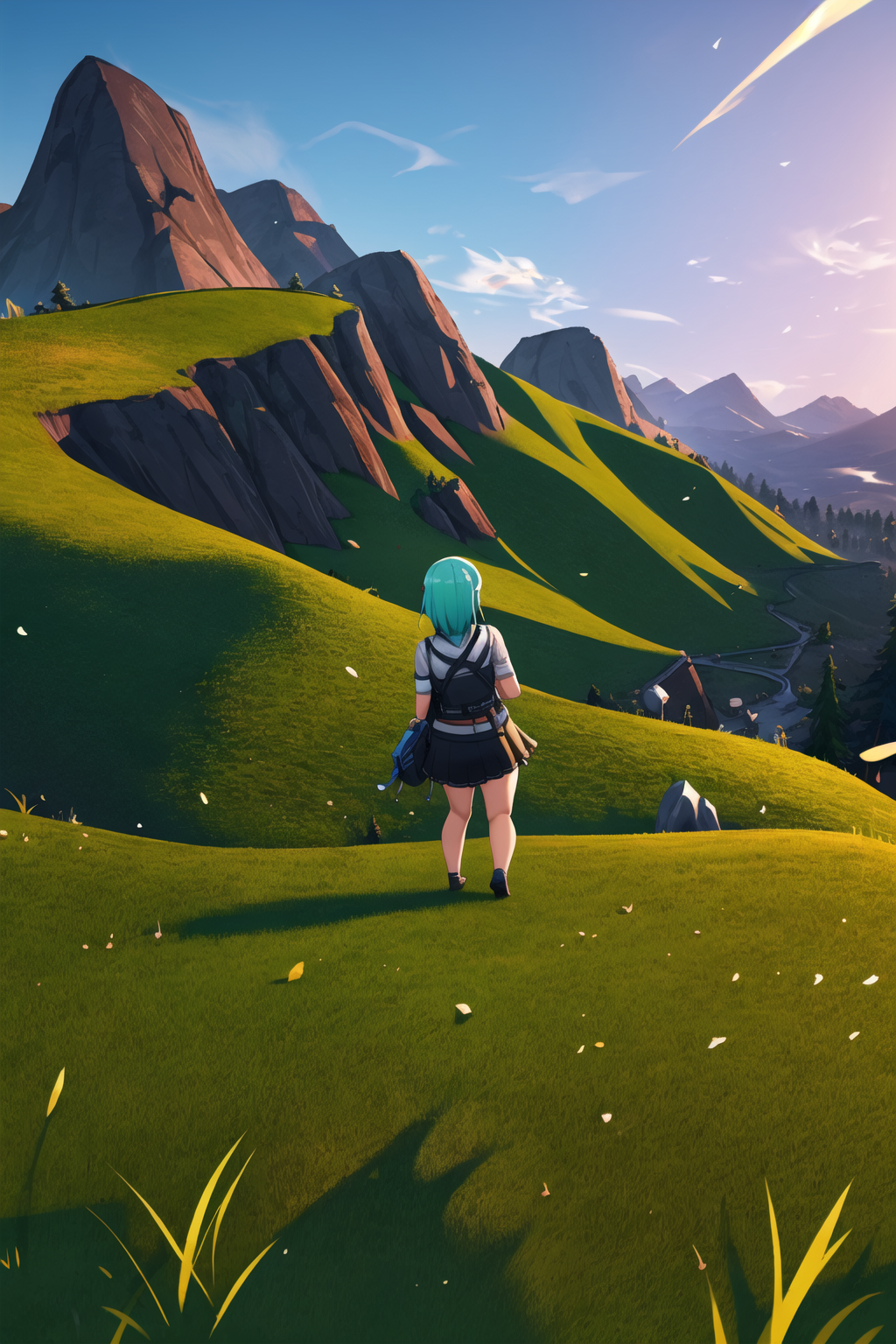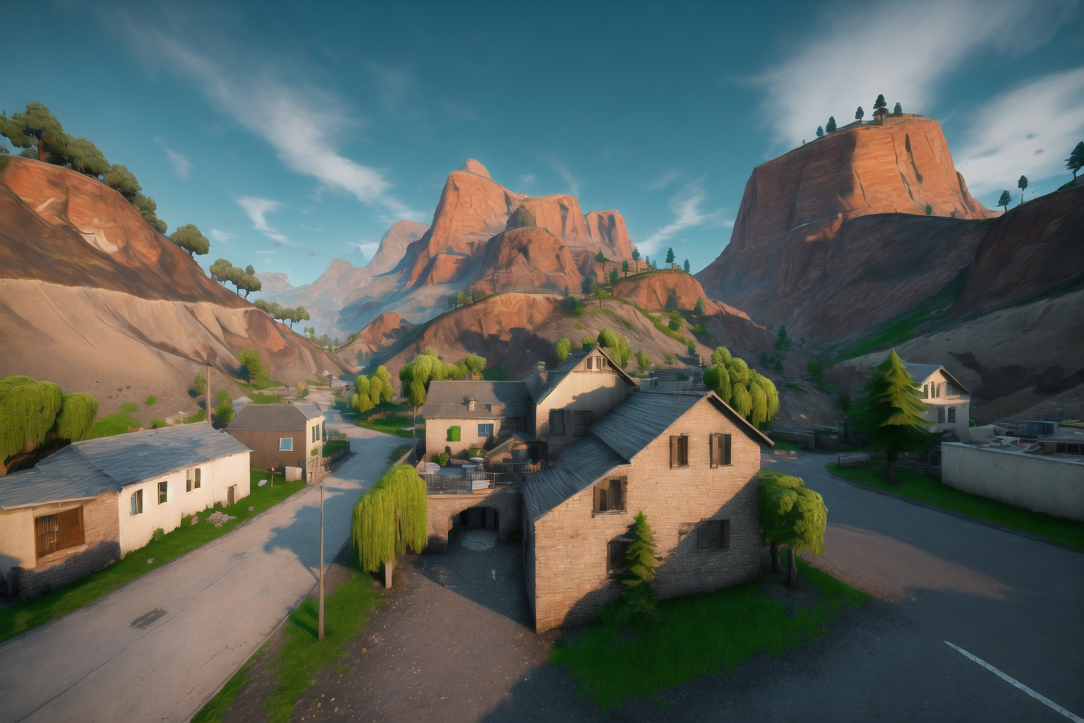 Scenes, landscapes, buildings and backgrounds from the Chapter 1 "Season OG" of Fortnite, captured in near maximum graphics settings in replay mode. These were captured without any people in the reference material, as it's intended for backgrounds and wallpapers, but it does work with people included as well. One thing to note is that it's not trained on the in-game names of the locations, for example prompting "tilted towers" will not recreate the city.