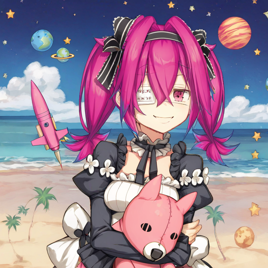 mayoinachi, 1girl,twintails, stuffed toy, gothic lolita, lolita fashion, stuffed animal, pink hair, hairband, Hawaii, beach, sunny, smile, (toys, rocket, space, earth:1.3),
