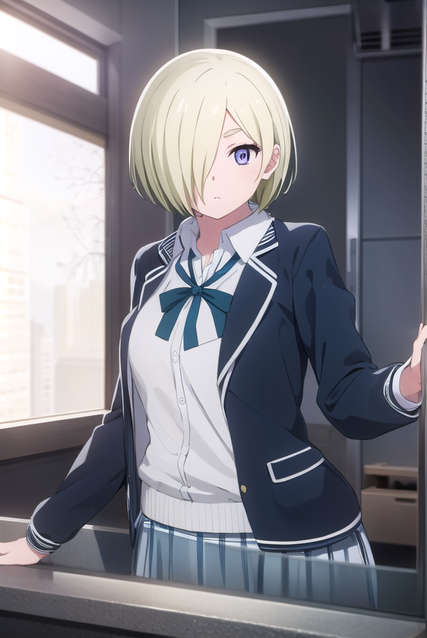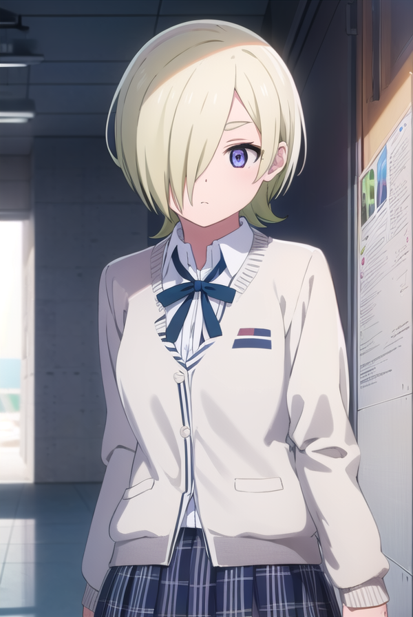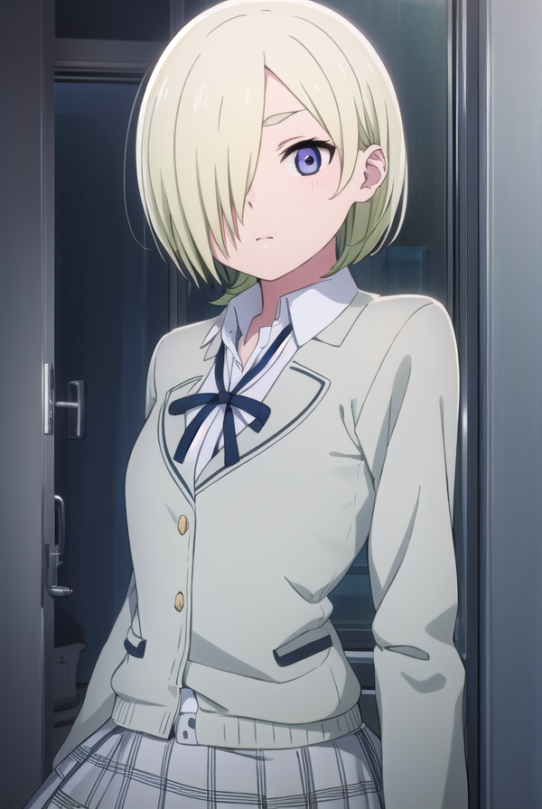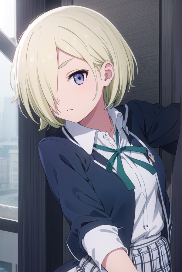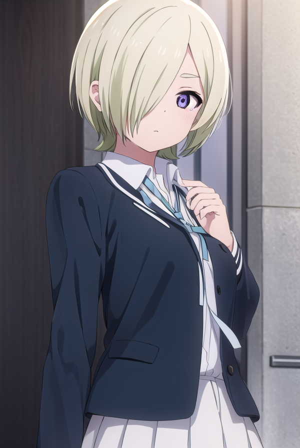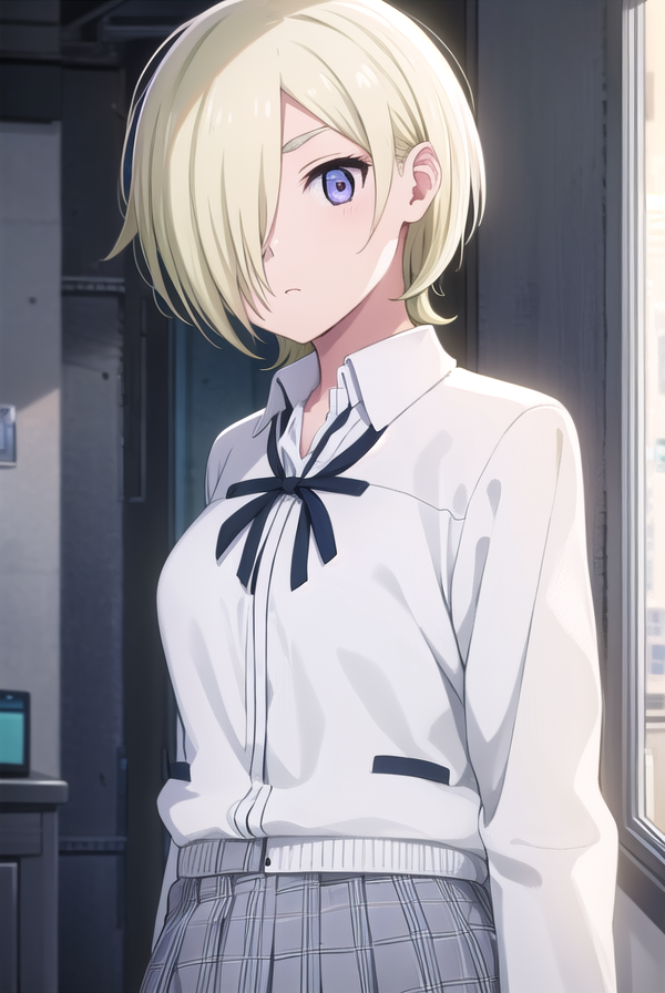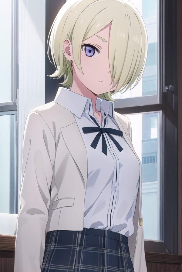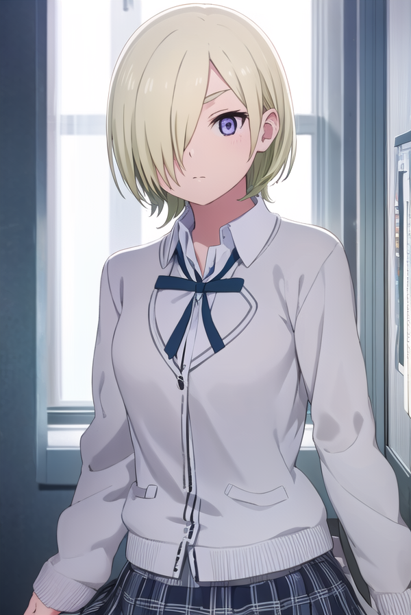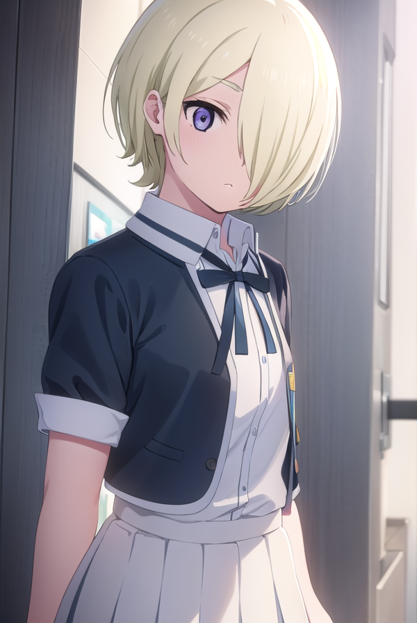 mia taylor, short hair, blonde hair, (purple eyes:1.1), (hair over one eye:1.5),
