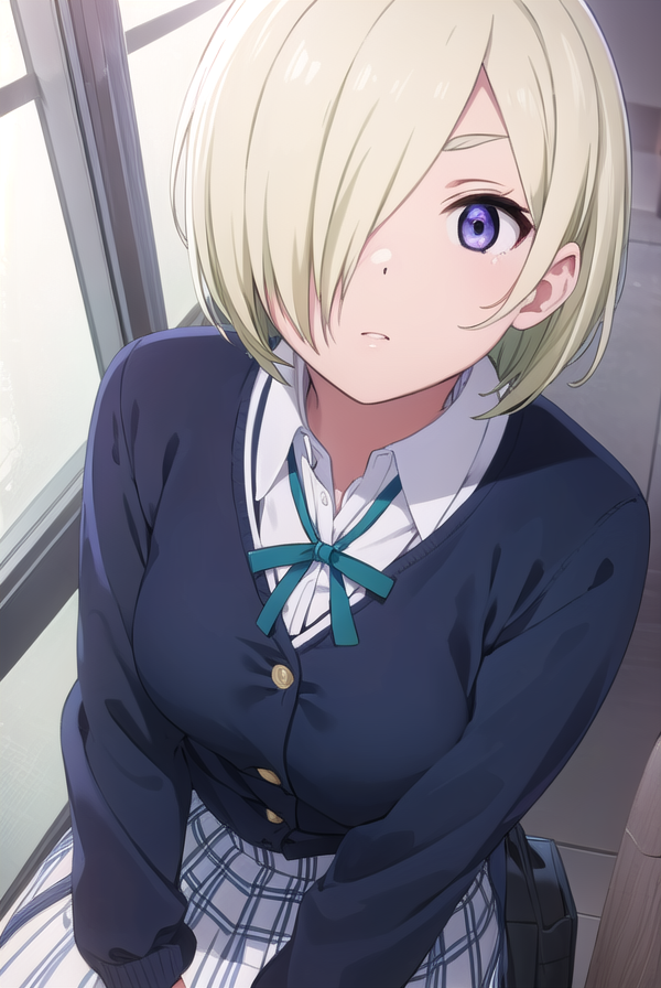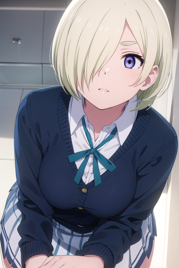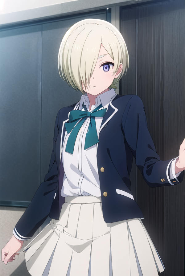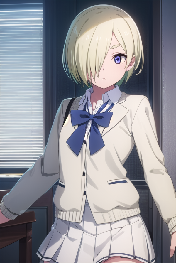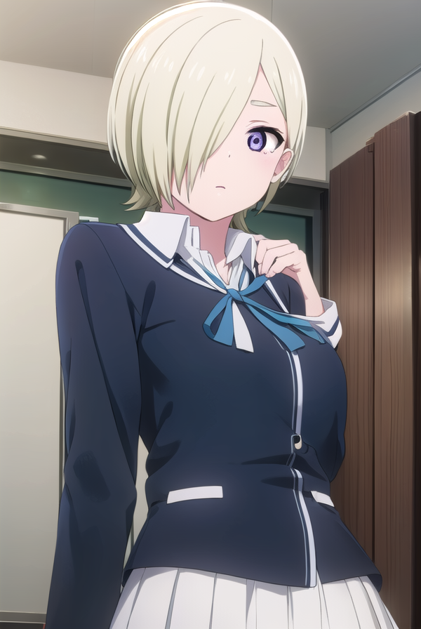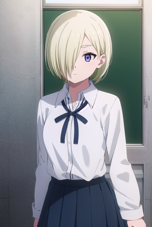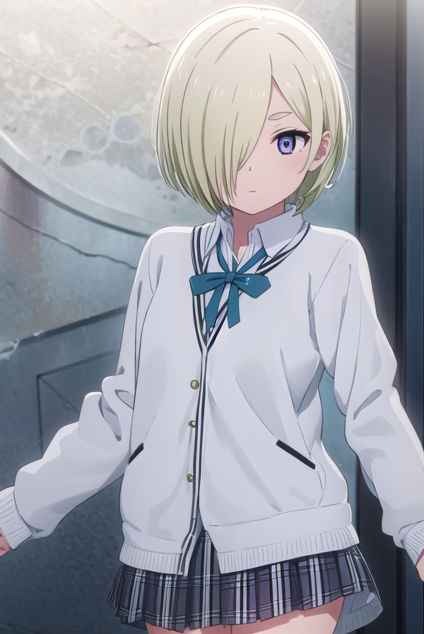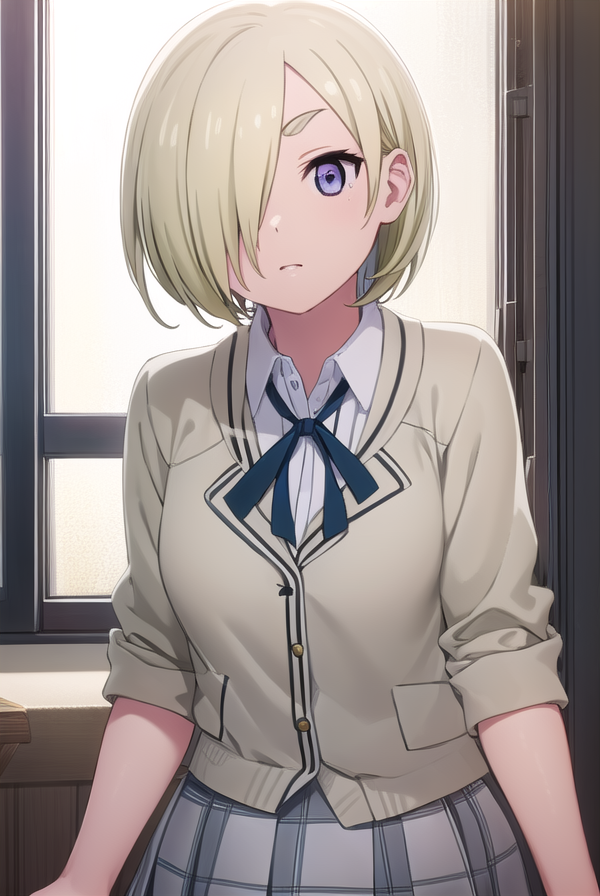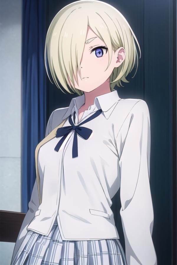 mia taylor, short hair, blonde hair, (purple eyes:1.1), (hair over one eye:1.5),