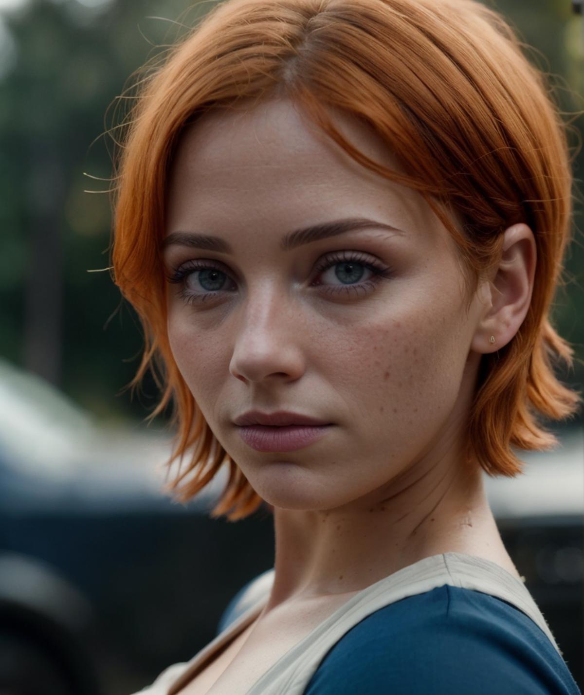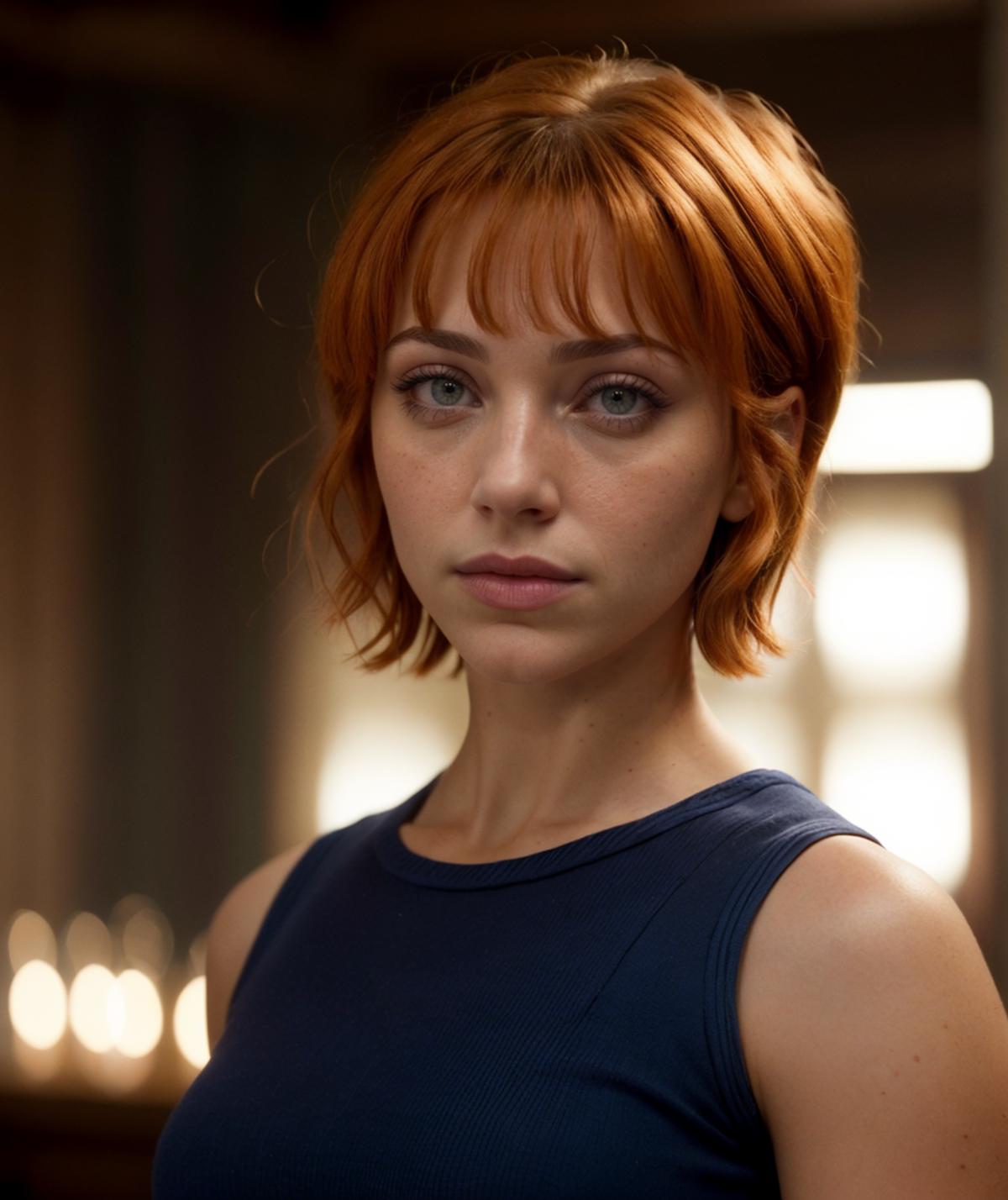 cinematic film still <lora:quiron_EmilyRuddNamiQuiron_v020310_Lora:0.77> emilyruddNamiQuiron woman, 1girl, realistic, solo, short hair, orange hair, lips, blue eyes, looking at viewer, parted lips, . shallow depth of field, vignette, highly detailed, high budget Hollywood movie, bokeh, cinemascope, moody, epic, gorgeous, film grain, grainy
