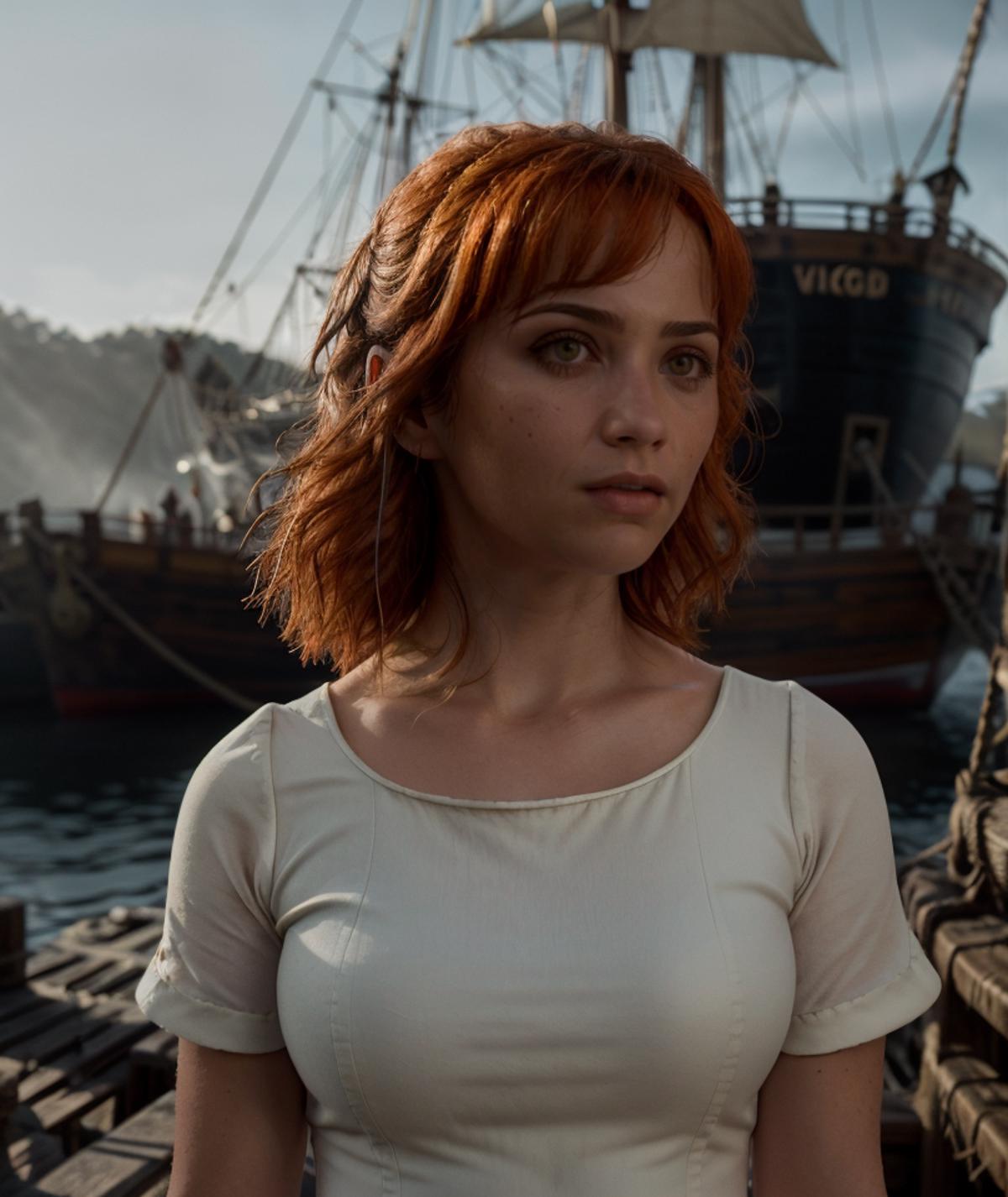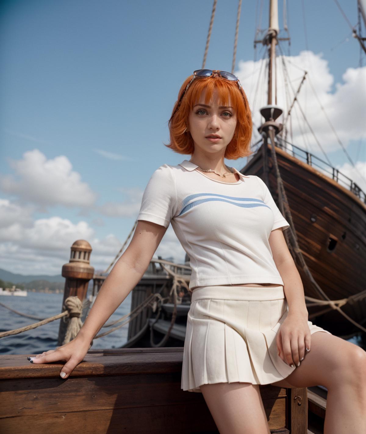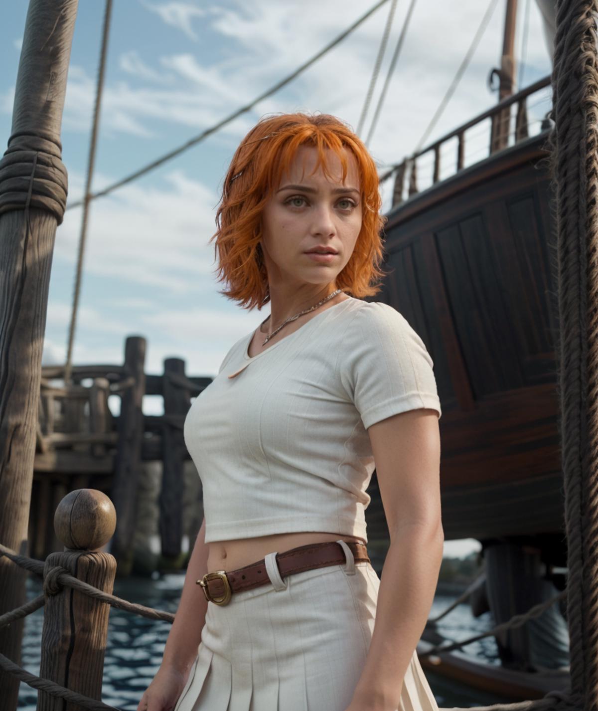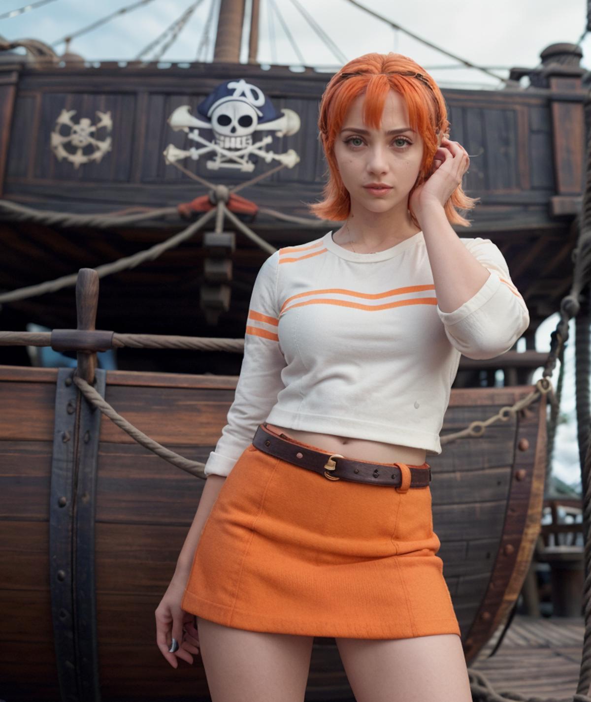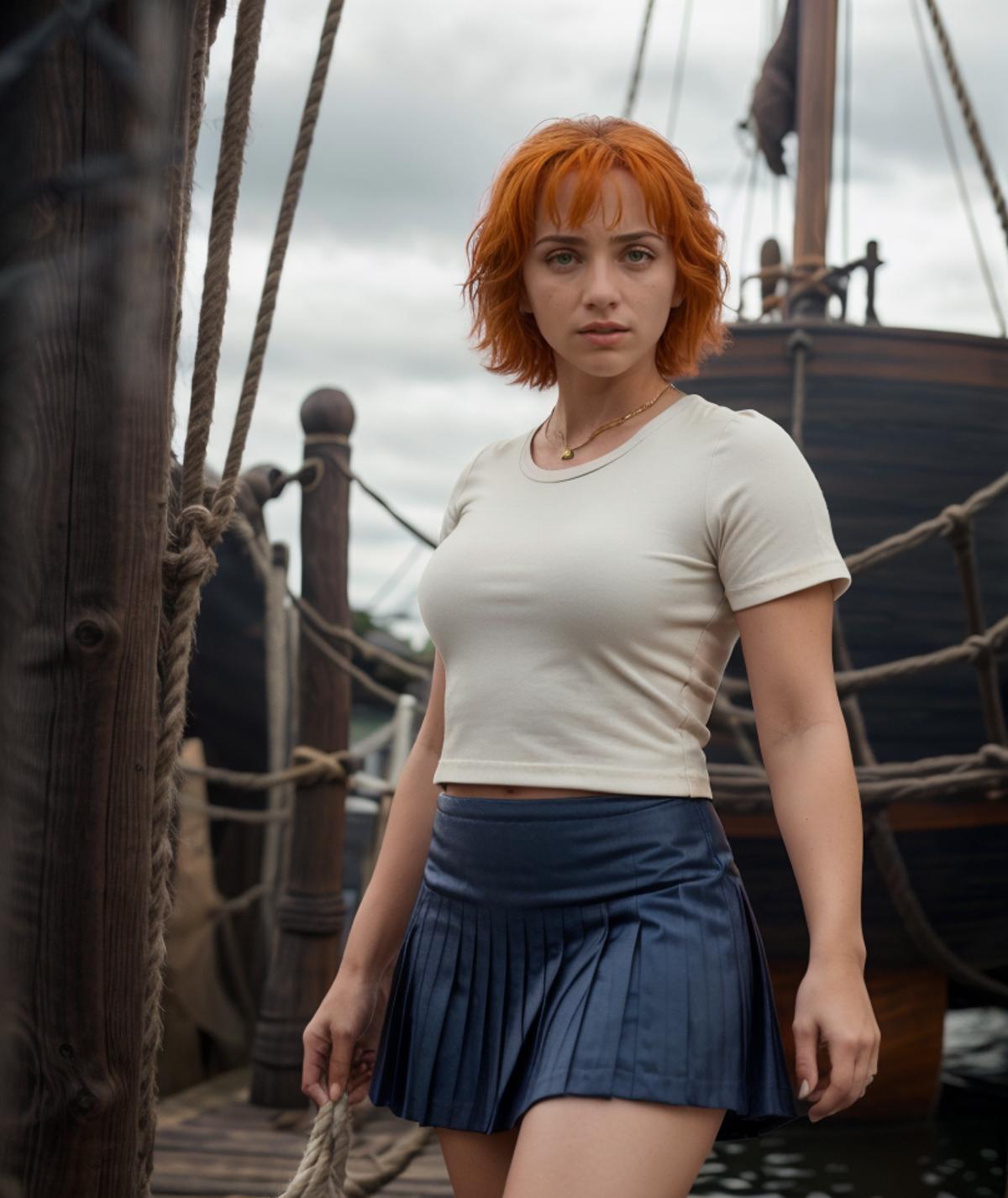 cinematic photo <lora:quiron_EmilyRuddNami_v2_Lora:0.87>emilyruddnami, 1girl, realistic, EmilyRuddNamiQuiron, orange hair, wearing clothes Nami from One Piece Anime series , Old wooden Pirate ship, wearing a white-and-blue striped shirt, wearing high-heeled sandals, a brown blouse that exposes her abdomen, and a pale blue, pleated mini-skirt . 35mm photograph, film, bokeh, professional, 4k, highly detailed