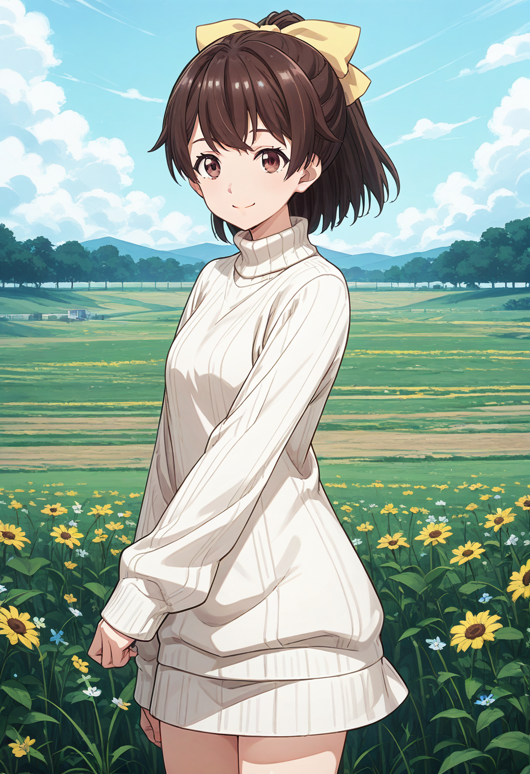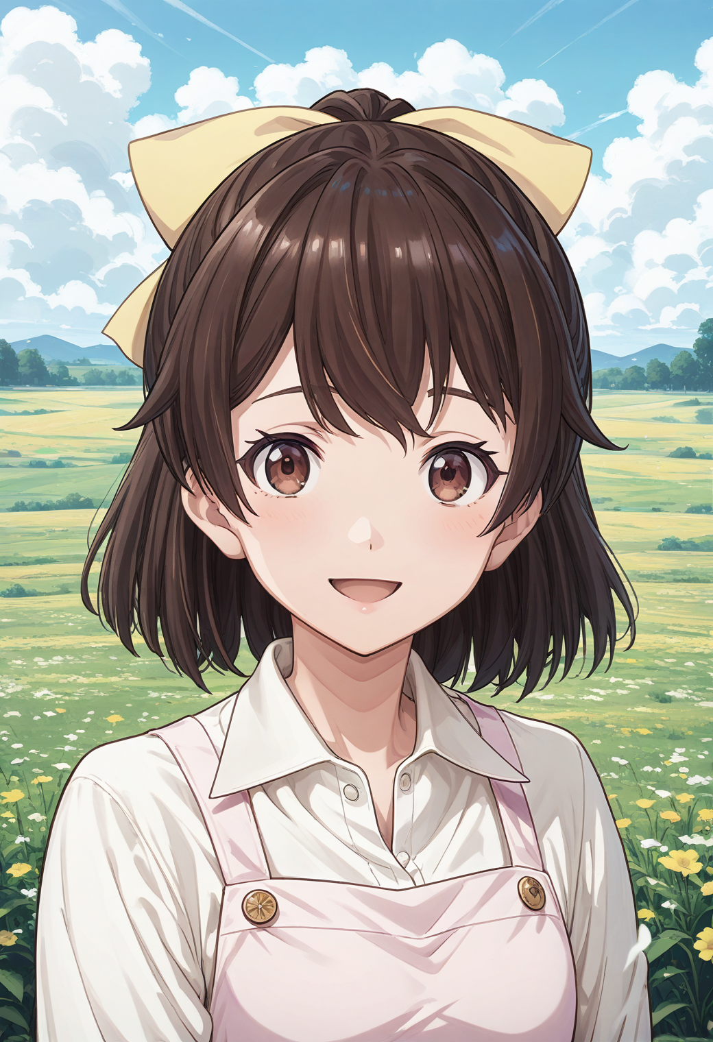 Trigger word: tantei1 akane, brown eyes, brown hair, ponytail, bangs, yellow bow, hair bow,