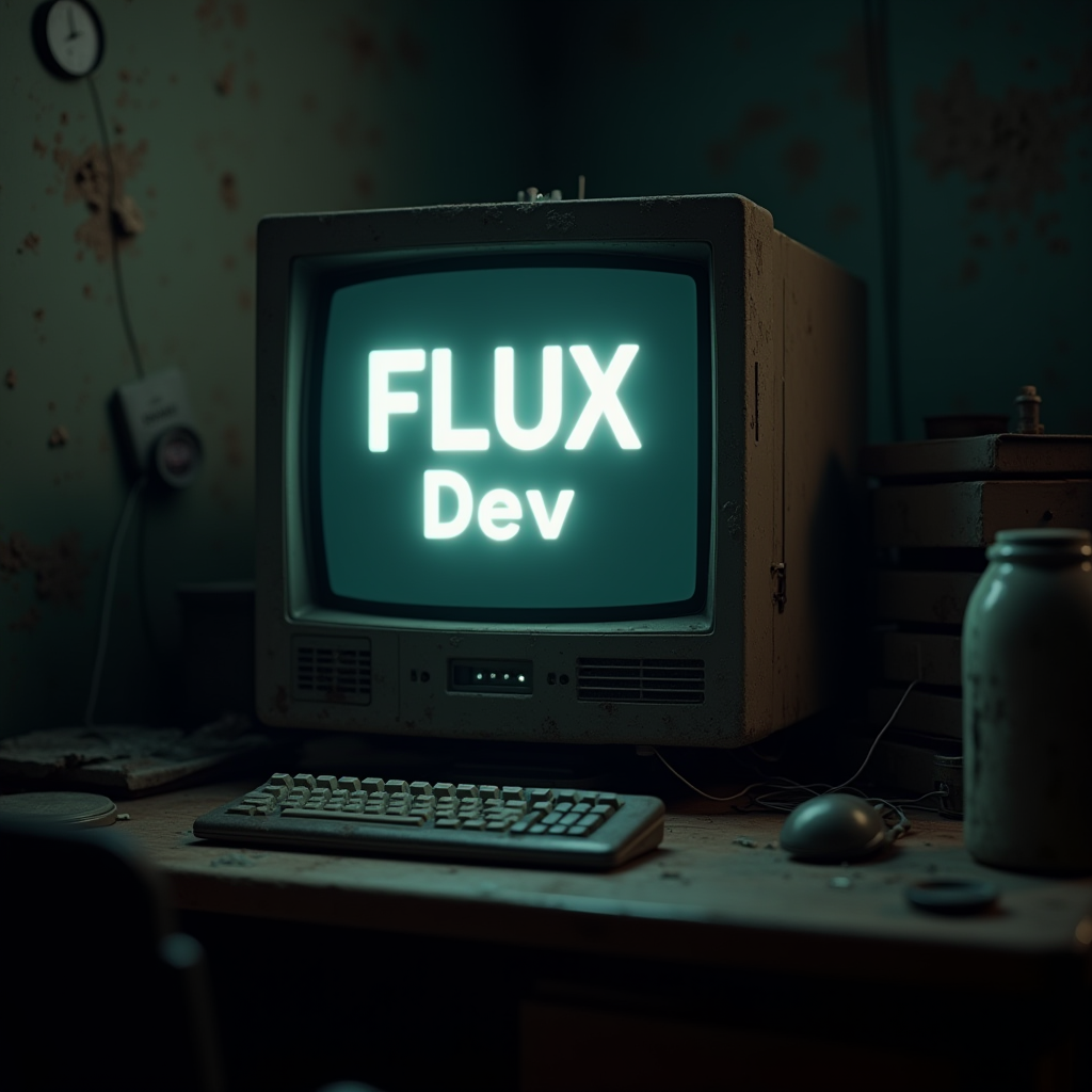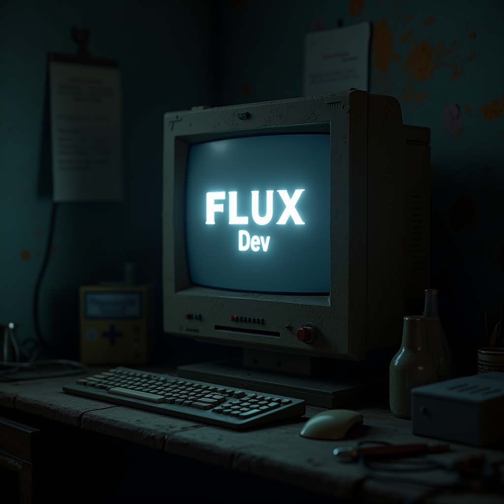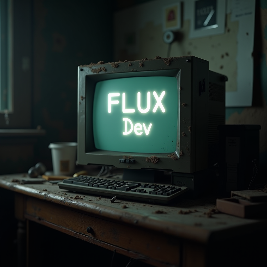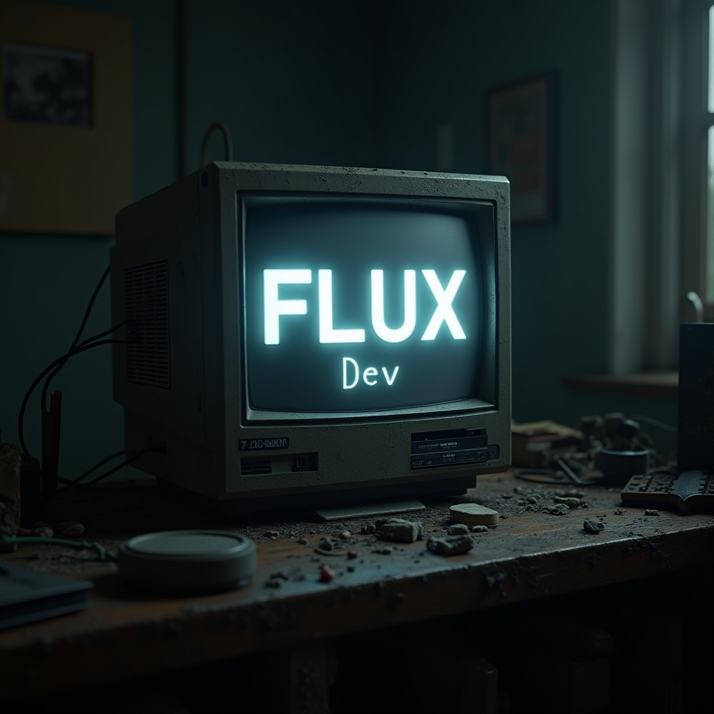 detailed cinematic dof render of an old dusty detailed CRT monitor on a wooden desk in a dim room with items around, messy dirty room. On the screen are the letters “FLUX Dev” glowing softly. High detail hard surface render