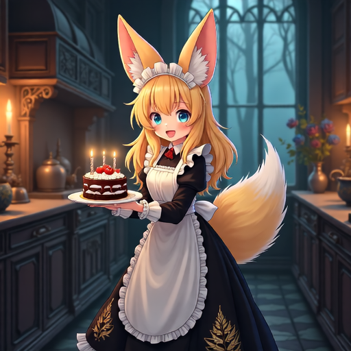 a cute anime girl with massive fennec ears and a big fluffy tail wearing a maid outfit walking towards the camera