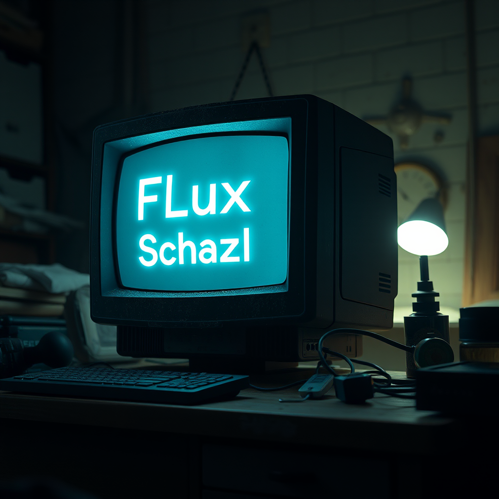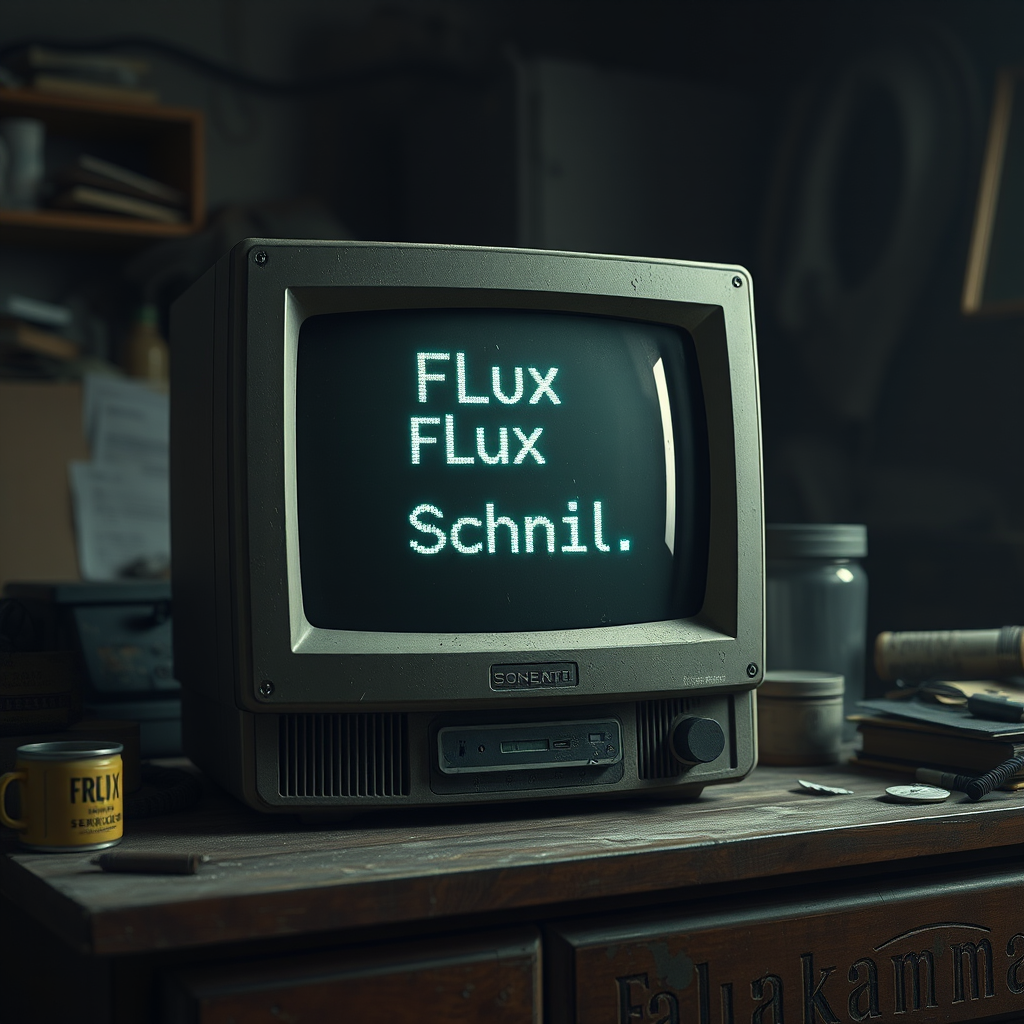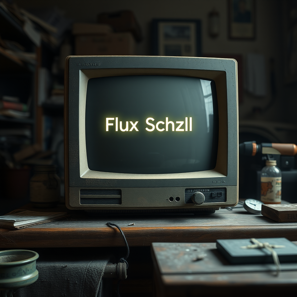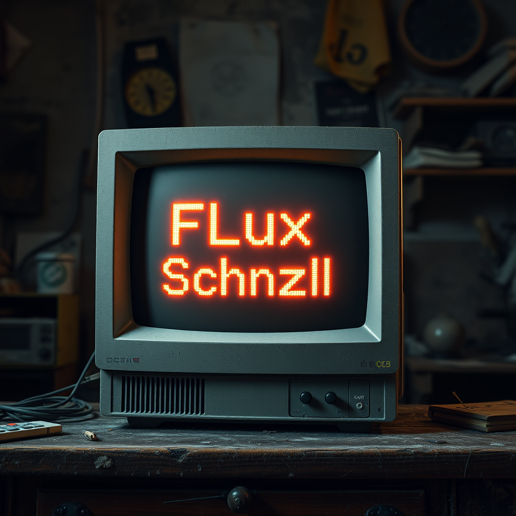 detailed cinematic dof render of an old dusty detailed CRT monitor on a wooden desk in a dim room with items around, messy dirty room. On the screen are the letters "FLUX Schnell" glowing softly. High detail hard surface render