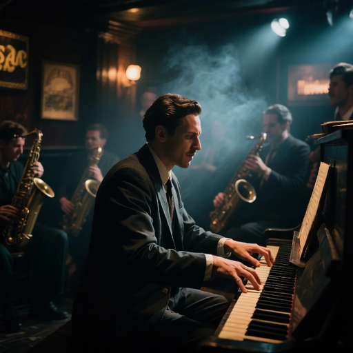 a vintage 1950s jazz bar, cinematic lighting, a well-dressed pianist playing passionately on an old upright piano, surrounded by saxophonists in dark suits, ambient smoke drifting in the warm air, smooth jazz atmosphere, camera slowly panning around the pianist, fingers moving on keys, soft spotlight from above, gentle camera shake and focus pull, close-up of piano keys, slow zoom in and out, realistic shadows and reflections, fun camera movement, Wan2.1 FunInP style, felt texture overlay, warm amber tones, retro film look, dynamic storytelling shot