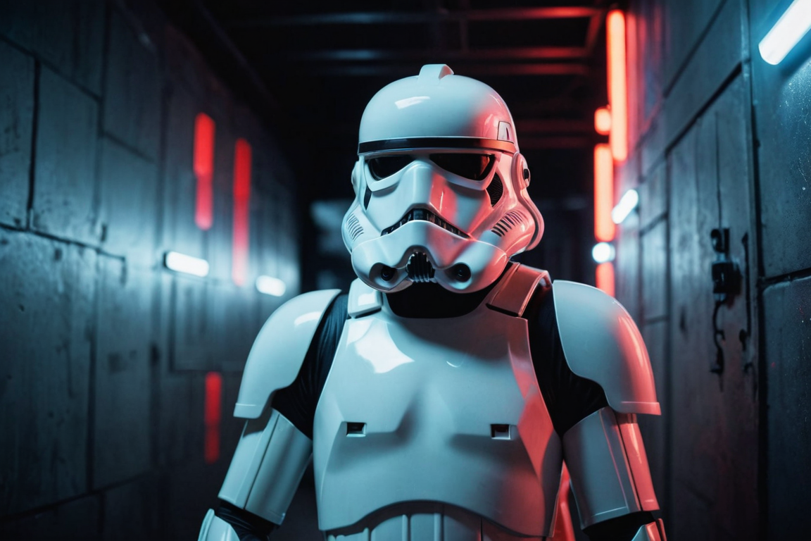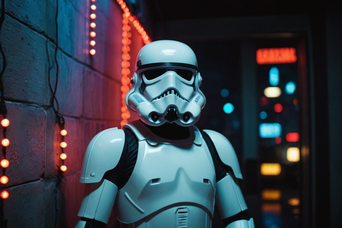 cinematic film still, Storm Trooper, colored lights, amazing quality, wallpaper, analog film grain