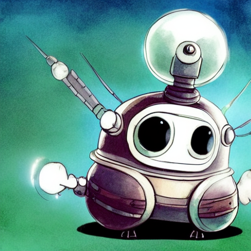 cute minimal spherical robot spaceship with big eyes on transparent background open mouth. ink and watercolor painting. low camera angle. game design concept character Ghibli don't starve Machinarium, centered, full frontal view