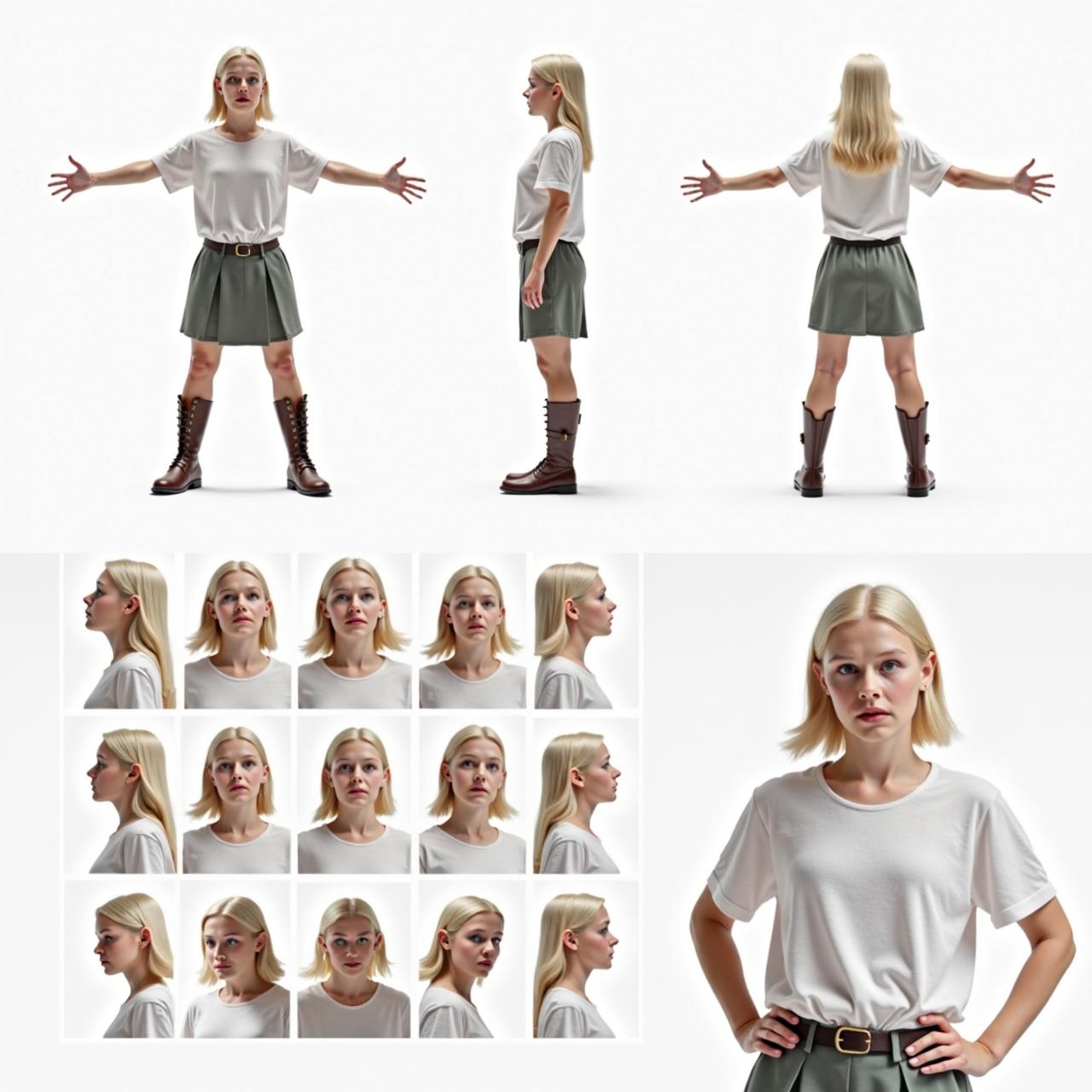 a character sheet of a middle aged man in disney style, wearing black clothes with red highlights, white background, multiple views, from multiple angles, visible face, portrait, neutral expression, it is a masterpiece, photography, american woman, blonde