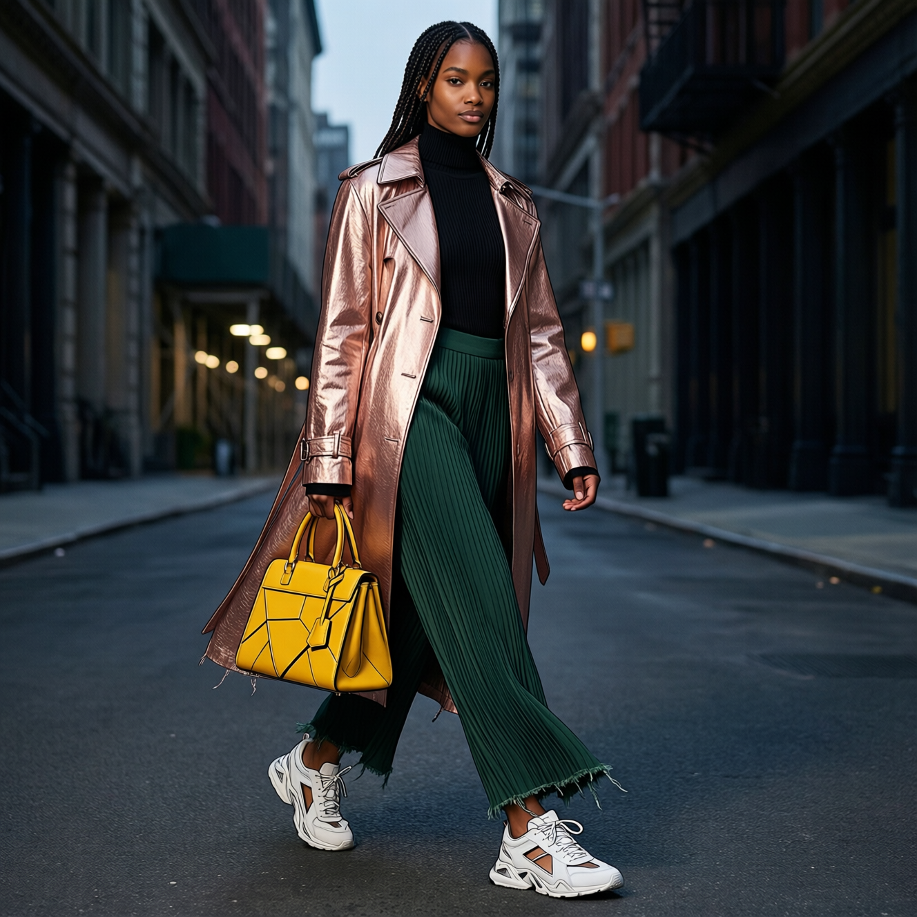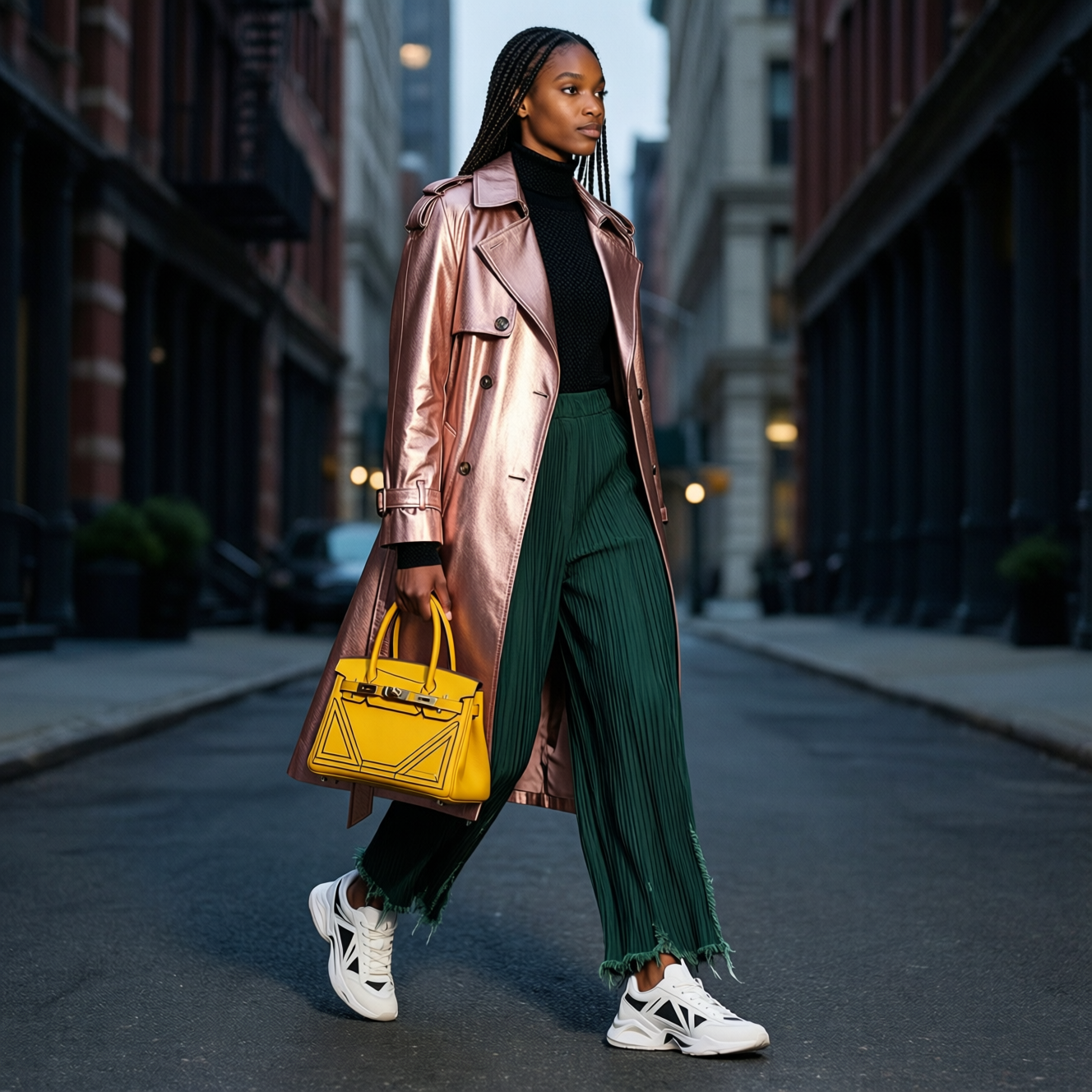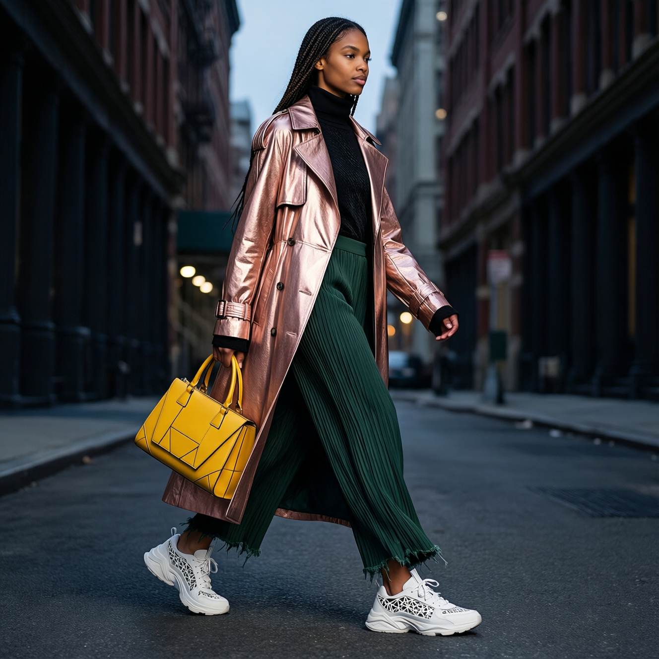 Urban alleyway at dusk. Tall, statuesque high-fashion model striding elegantly, mid distant full body shot from an angular perspective, cinematic/editorial with bold contrasts and tactile materials. They wear a rose-gold metallic trench coat with deconstructed elements over a black long-sleeved turtleneck with subtle texture; paired with forest-green pleated pants with raw hems and a soft texture. Long braided dark hair, medium complexion. They carry a vibrant yellow designer handbag with geometric details and a structured silhouette. White architectural sneakers with bold geometric cutouts. Bold, high-contrast, tactile, urban-grit meets high-fashion impact, extreme clarity, extreme layering, post-processing with transparent light-transmitting ultra-smooth high-definition film effect, removing all noise and grain, removing all blur, removing all vintage feel, removing all roughness, drawn with 32K pixel precision, unparalleled fine line drawing of every single detail, the entire image like a brand new photograph, photorealistic