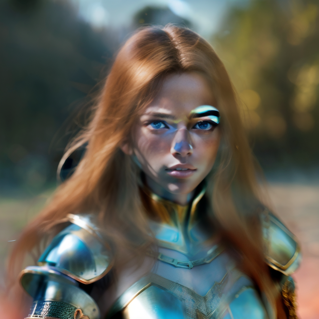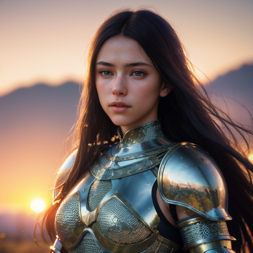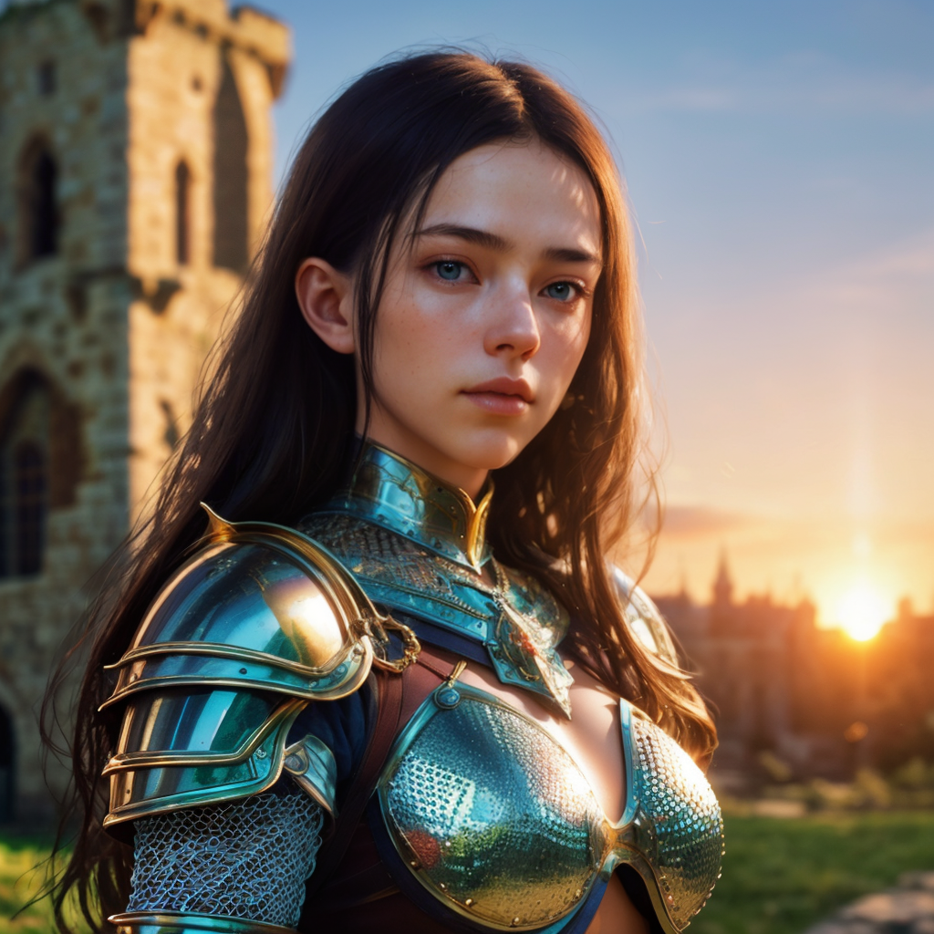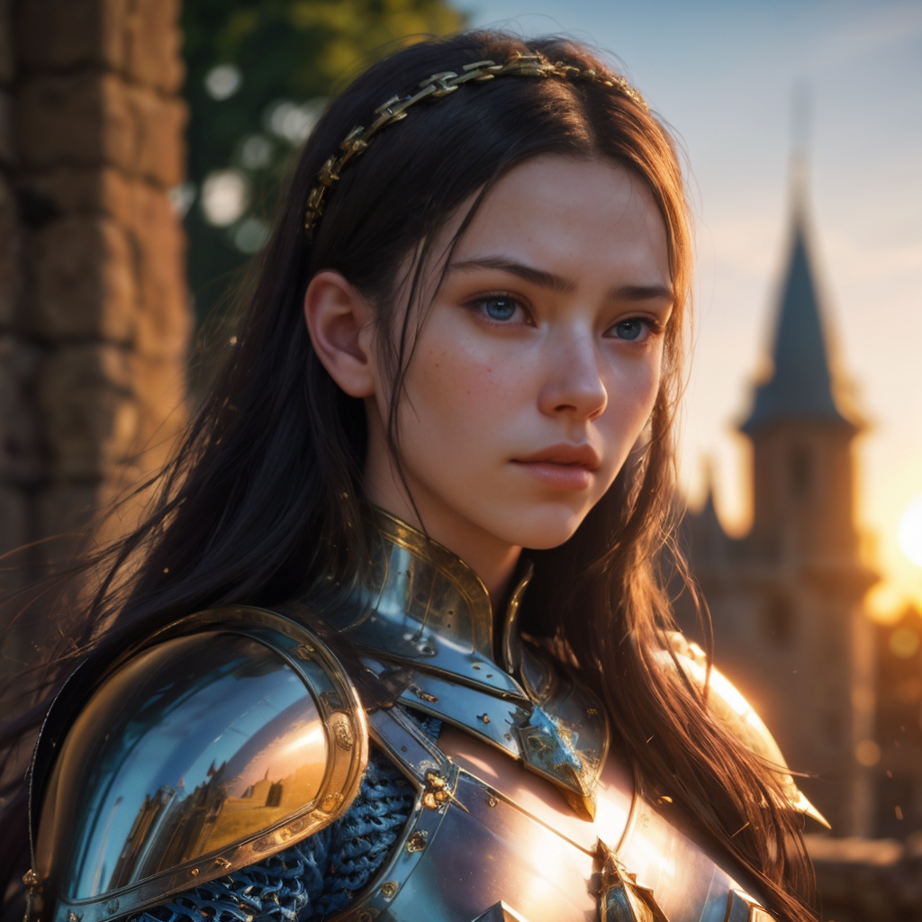 portrait of a girl, the most beautiful in the world, (medieval armor), metal reflections, upper body, outdoors, intense sunlight, far away castle, professional photograph of a stunning woman detailed, sharp focus, dramatic, award winning, cinematic lighting, octane render unreal engine, volumetrics dtx, film grain, blurry background, blurry foreground, bokeh, depth of field, sunset, motion blur, chainmail