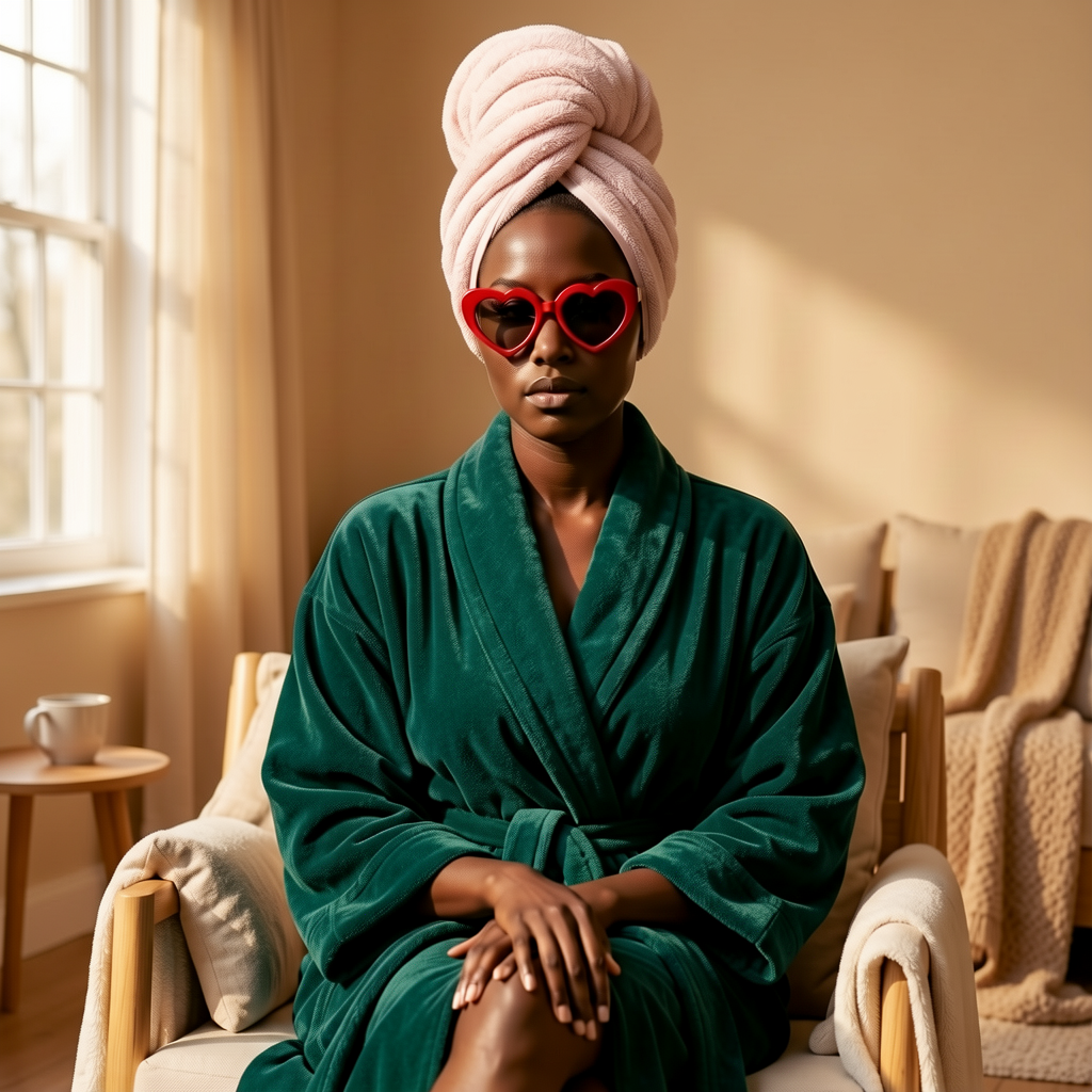 Change the background to a cozy, softly lit interior space with warm beige tones, soft natural window light filtering through, and a relaxed, intimate atmosphere similar to the original image's mood. Keep the person in the exact same position, scale, and pose. Maintain identical camera angle, framing, and perspective. The lighting should be soft, even, and warm - not harsh or bright. Only replace the room environment, preserving all facial features, hairstyle, expression, clothing, and pose exactly as they are.