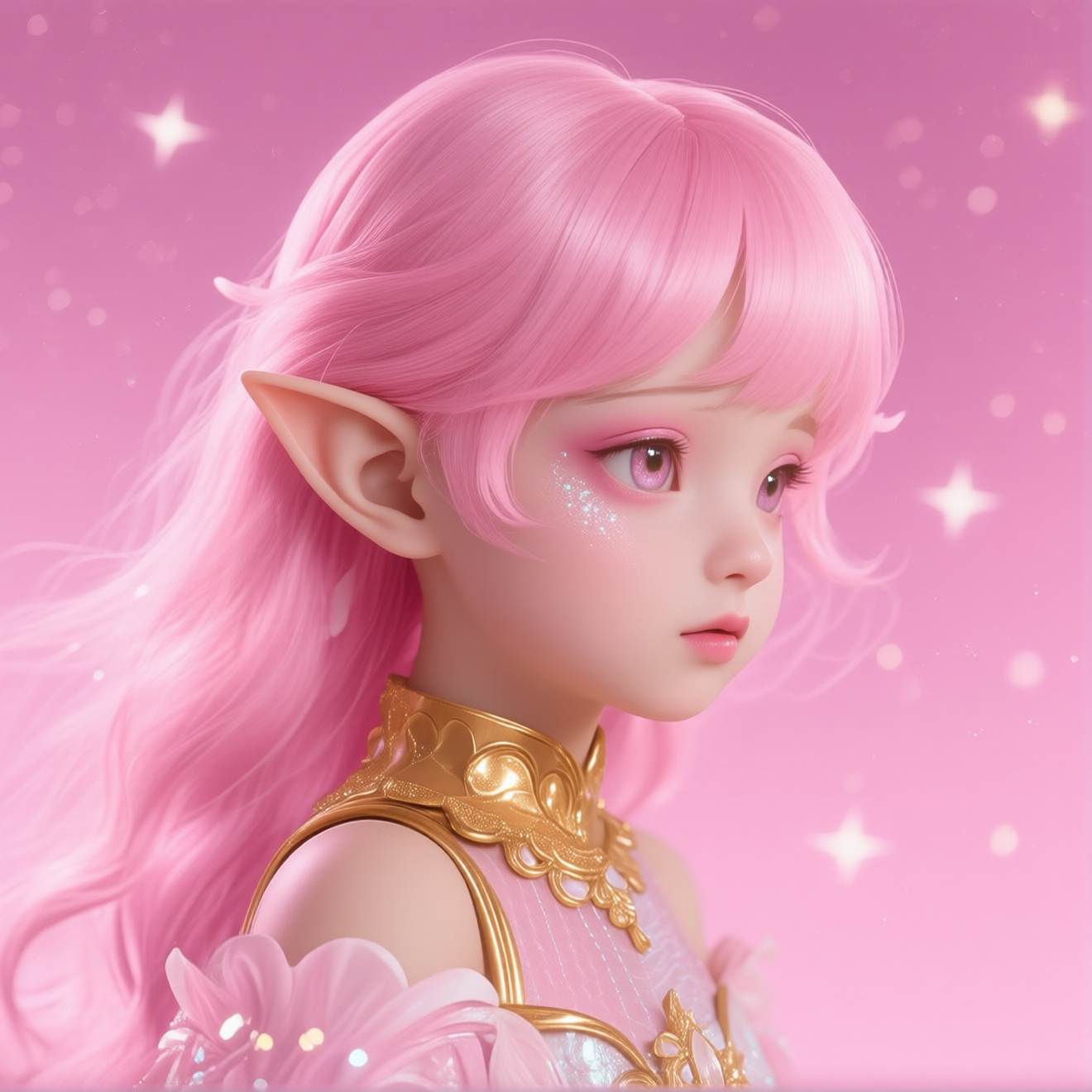 Conceptual makeup, a fairy girl with pink hair, pink shimmery scales dotted at the corners of her eyes, starry eyeshadow, makeup painting, thin eyebrows, three-dimensional features, a glossy finish, dazzling gold powder, silver fine glitter, a sense of layering and depth in the makeup, decorated with gold ornaments, pearlescent eyeshadow, dreamy makeup, soft pastels and subtle sparkles, a mysterious and fantasy-filled atmosphere, high-end makeup, dappled light on the face, soft lighting, optimal shadows, complex depth of field, dramatic lighting, clear focus, 8k, high quality, Fujifilm filter, surreal, a dreamy pastel wonderland, bright colors, a starry pink background, realistic.