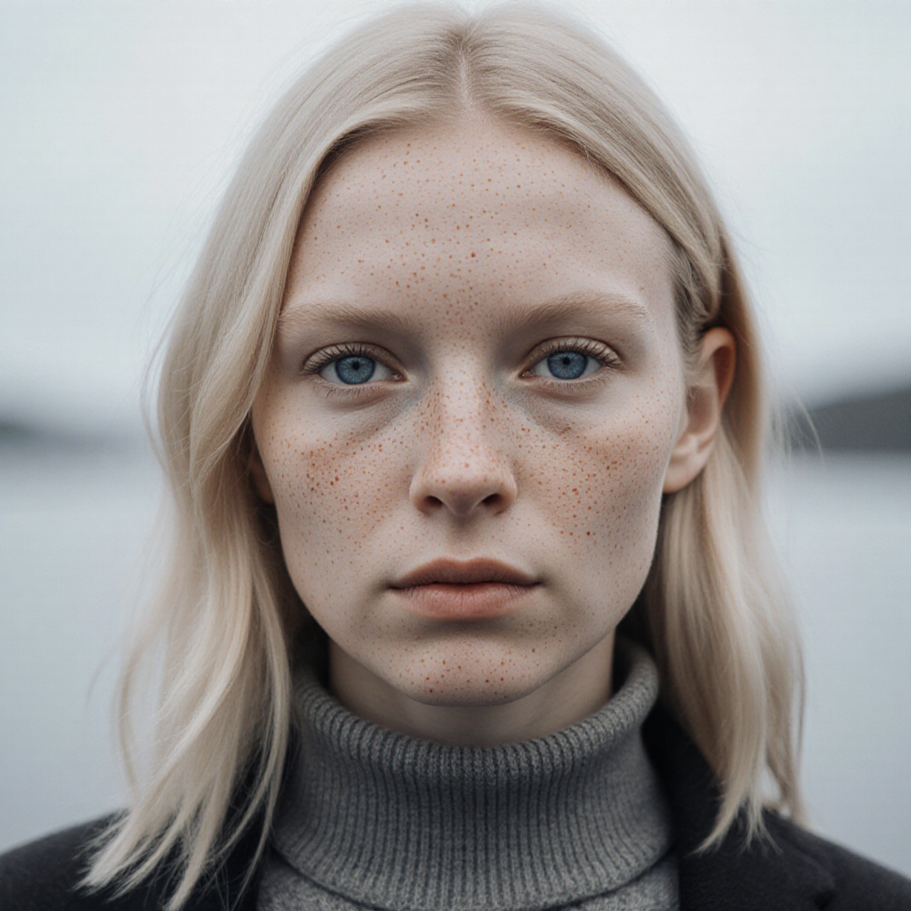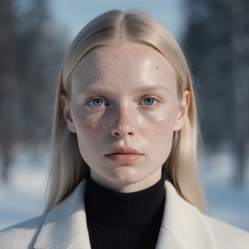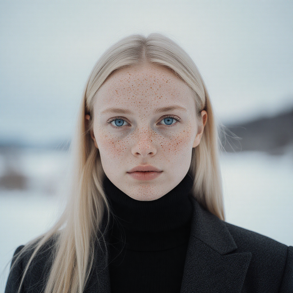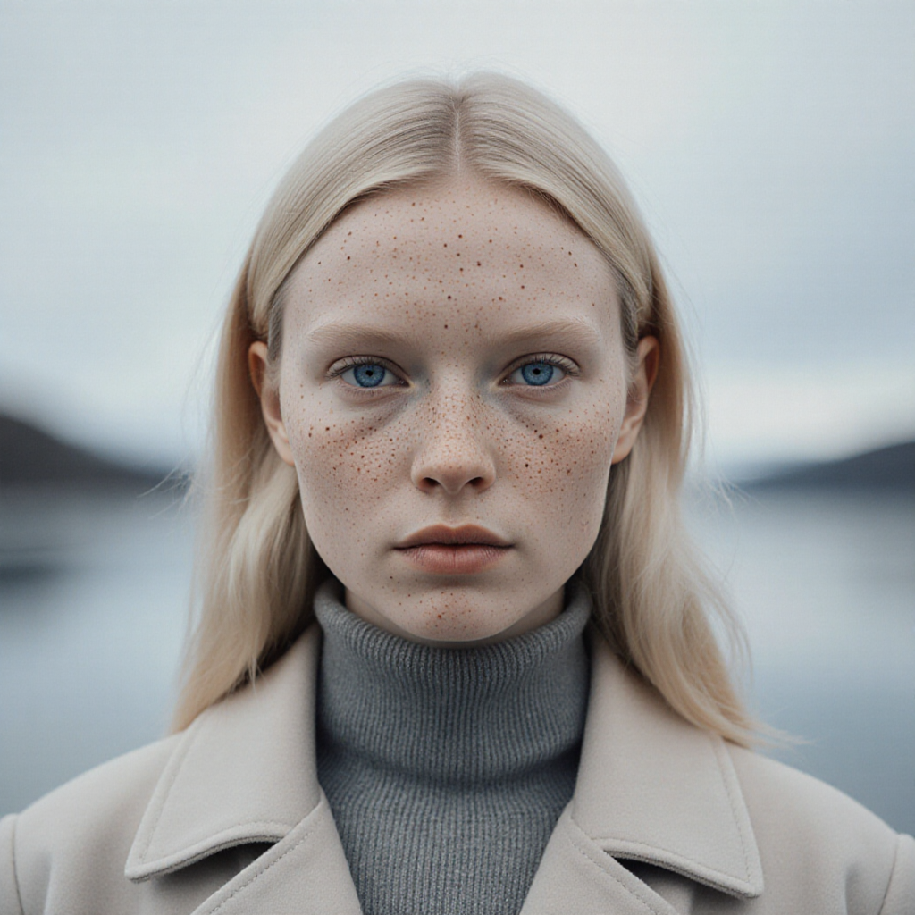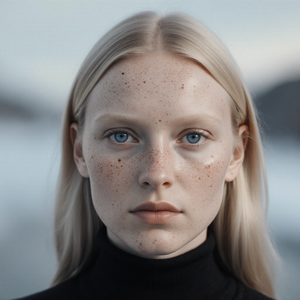 Highly realistic portrait of a Nordic woman with blonde hair and blue eyes, very few freckles on her face, gaze sharp and intellectual. The lighting should reflect the unique coolness of Northern Europe. Outfit is minimalist and modern, background is blurred in cool tones. Needs to perfectly capture the characteristics of a Scandinavian woman. solo, Centered composition
