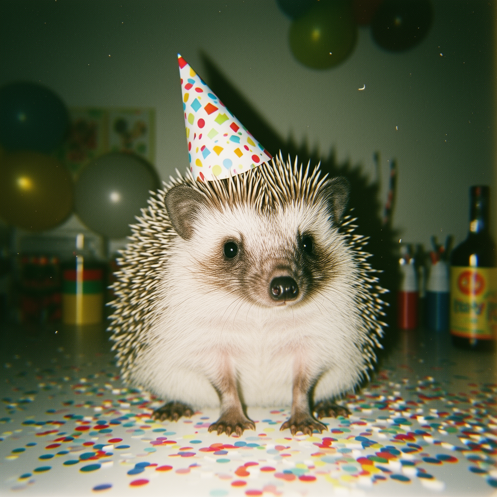 A hedgehog wearing a tiny party hat surrounded by confetti, early digital camera style, slight noise, flash photography, candid moment, 2000s digicam aesthetic, festive birthday celebration atmosphere