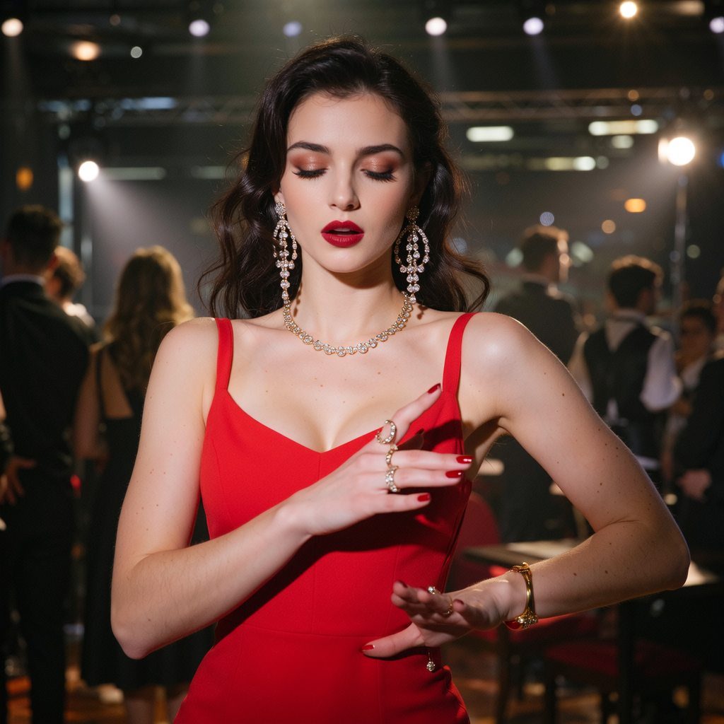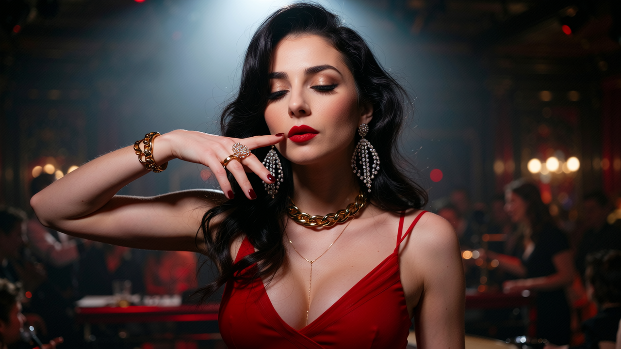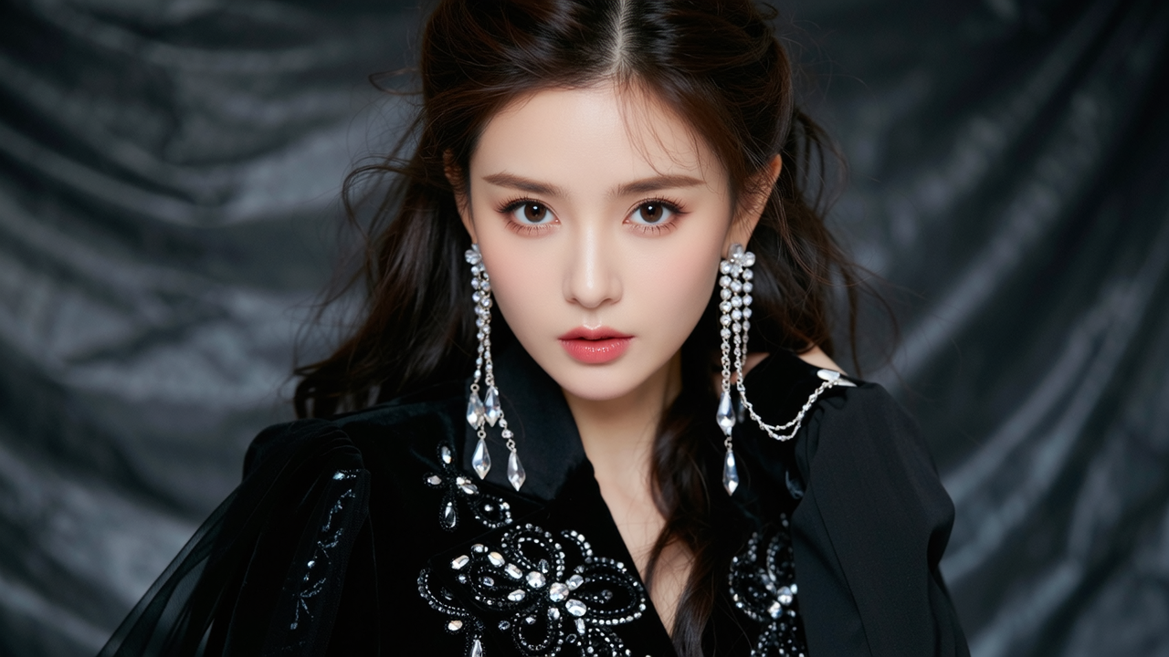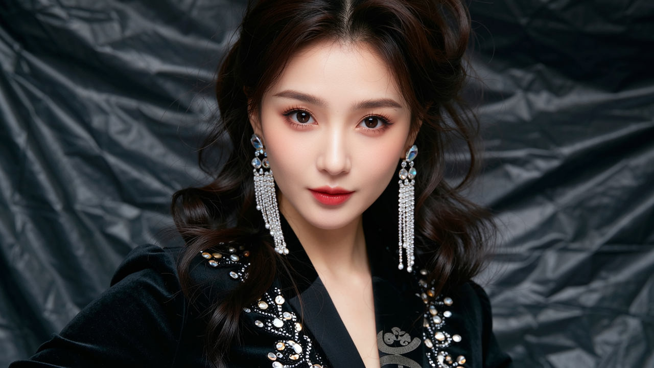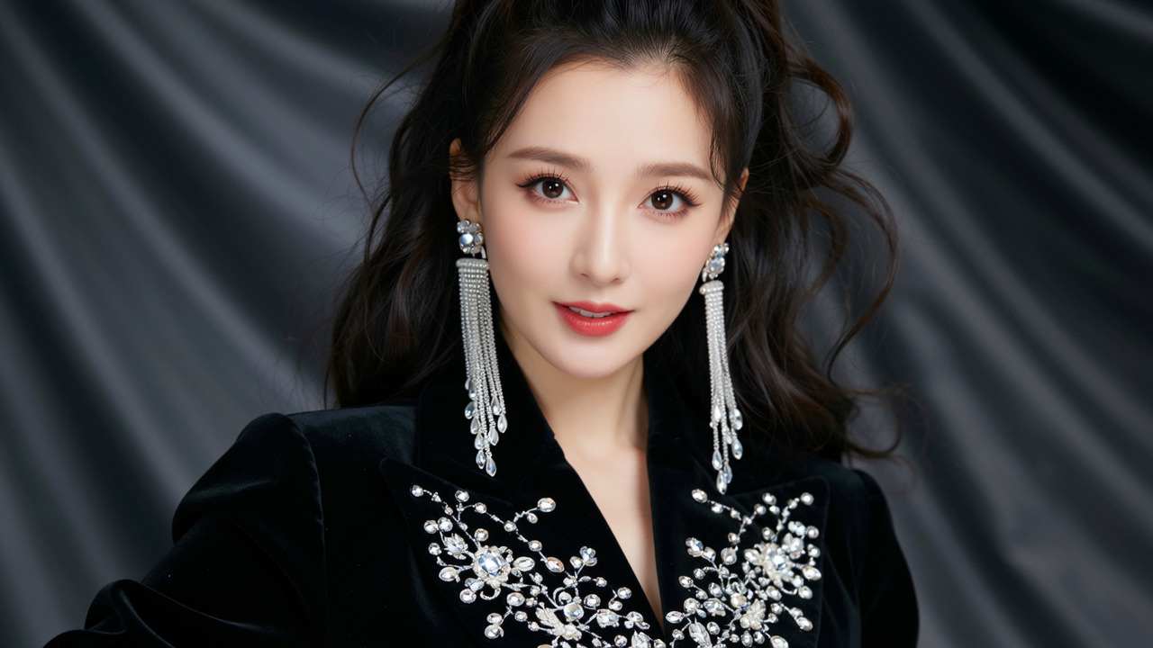 A dramatic, stylized portrait in a flowing black velvet blazer with intricate embroidered details, capturing an air of timeless elegance and mystery. Her light-skinned complexion glows under the soft studio lighting, emphasized by a meticulously styled voluminous updo and long, cascading iridescent crystal earrings that refract light with subtle brilliance. She gazes directly into the camera with a thoughtful expression, her lips painted a soft rose hue, framed by delicate blush and expertly applied eyeshadow. The background is a deep charcoal gray, subtly textured with soft fabric folds, creating a dramatic contrast that highlights the blazer's intricate beading and embroidery and her captivating presence. Conceptual art.