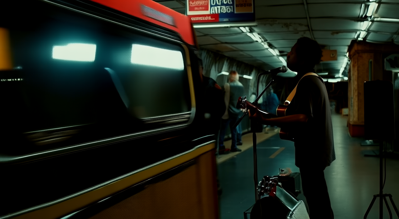 Low contrast. In a retro 1970s-style subway station, a street musician plays in dim colors and rough textures. He wears an old jacket, playing guitar with focus. Commuters hurry by, and a small crowd gathers to listen. The camera slowly moves right, capturing the blend of music and city noise, with old subway signs and mottled walls in the background.