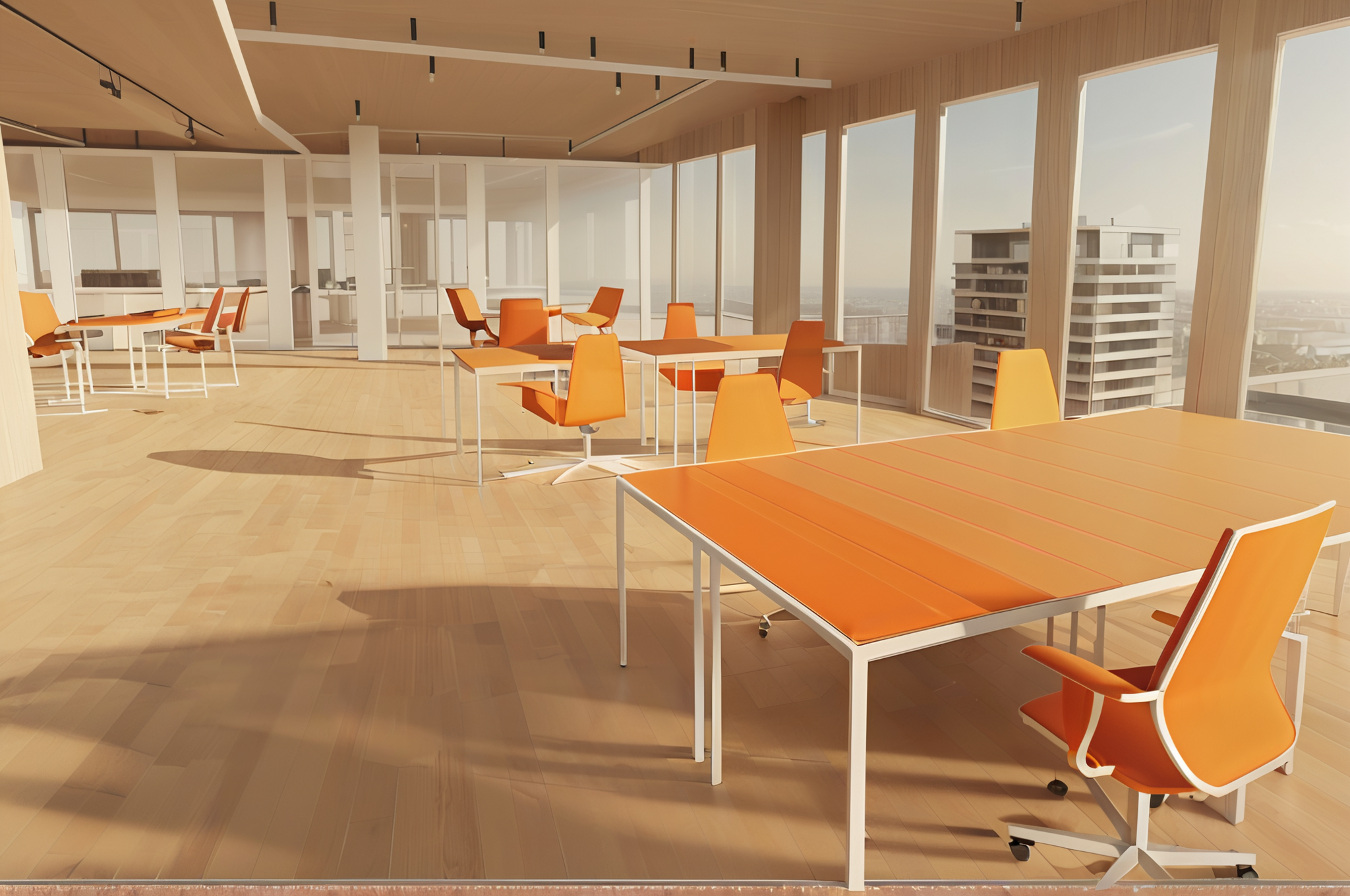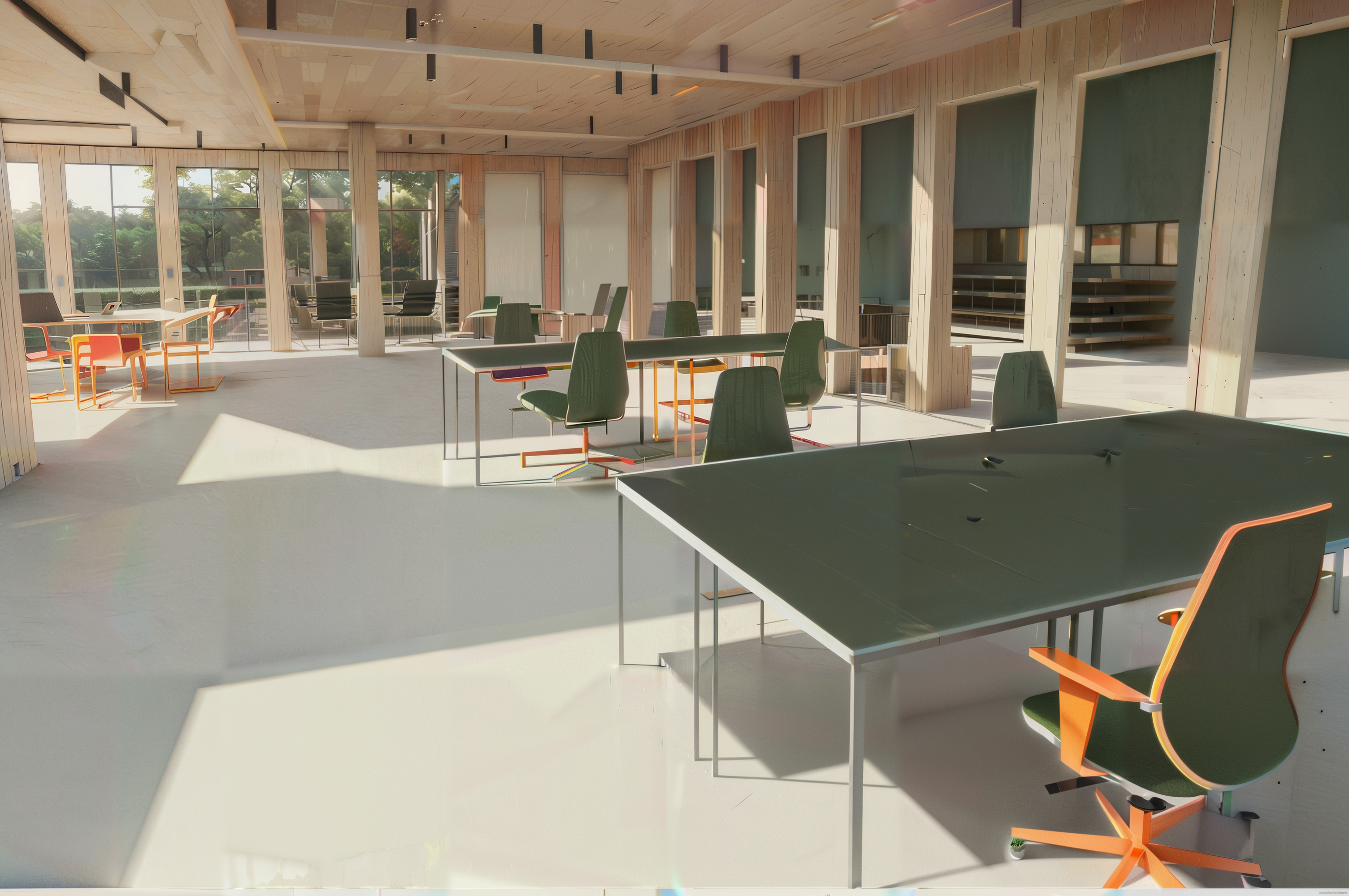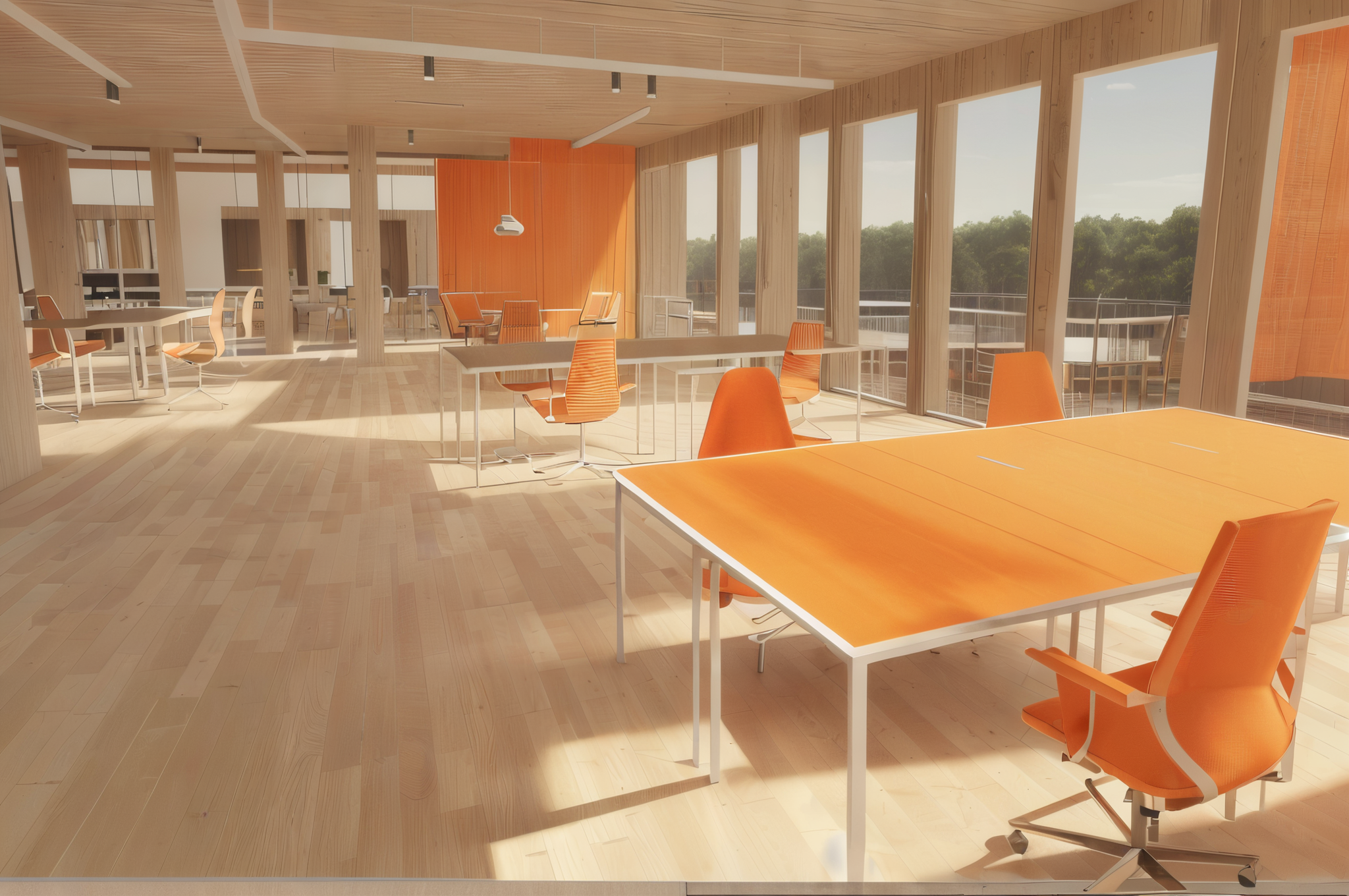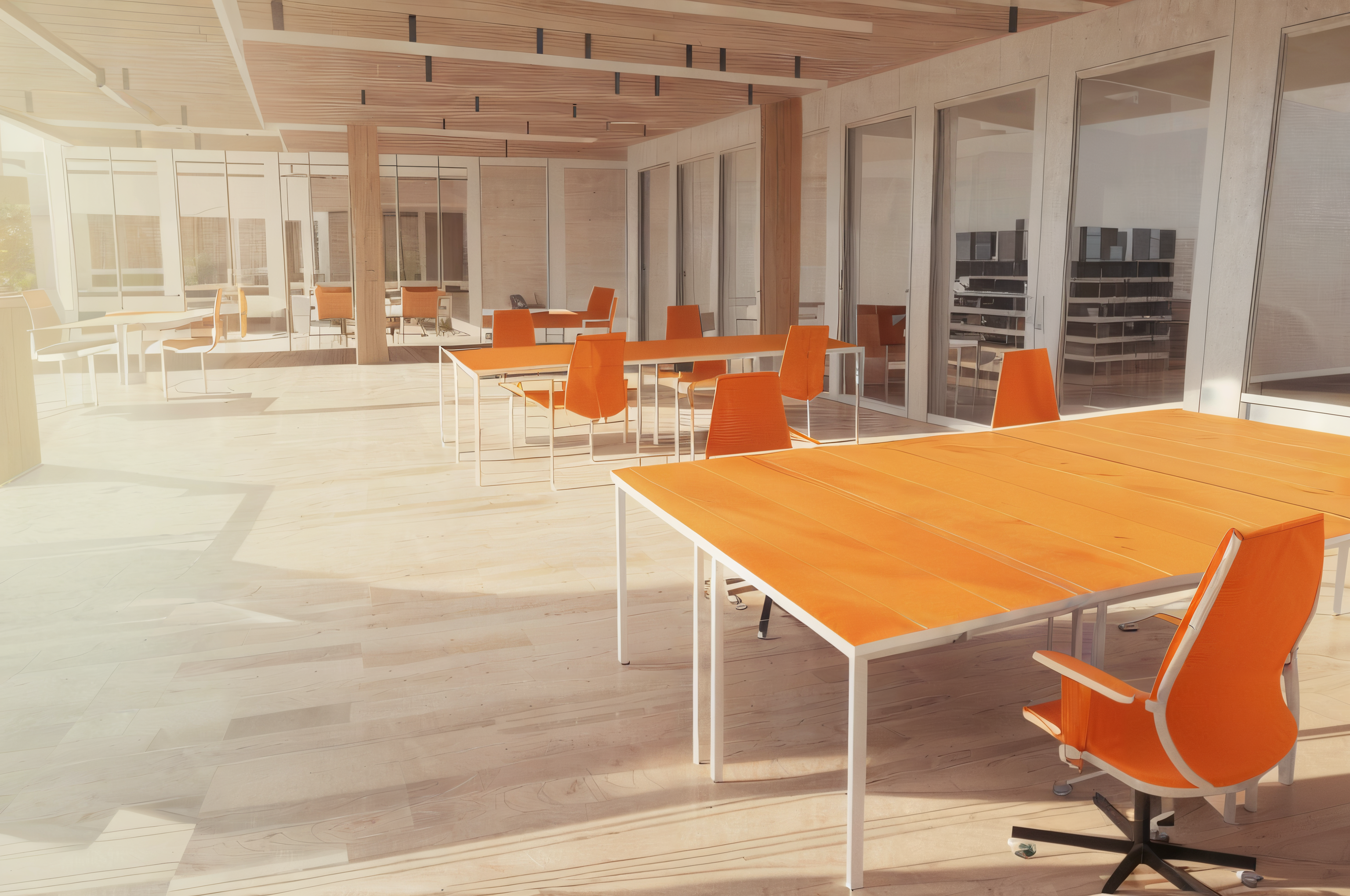 sunlight, wood flooring, metal frame, plants, orange chair fabric, realistic, photographic architecture (high quality) (sharp), highly detailed materials